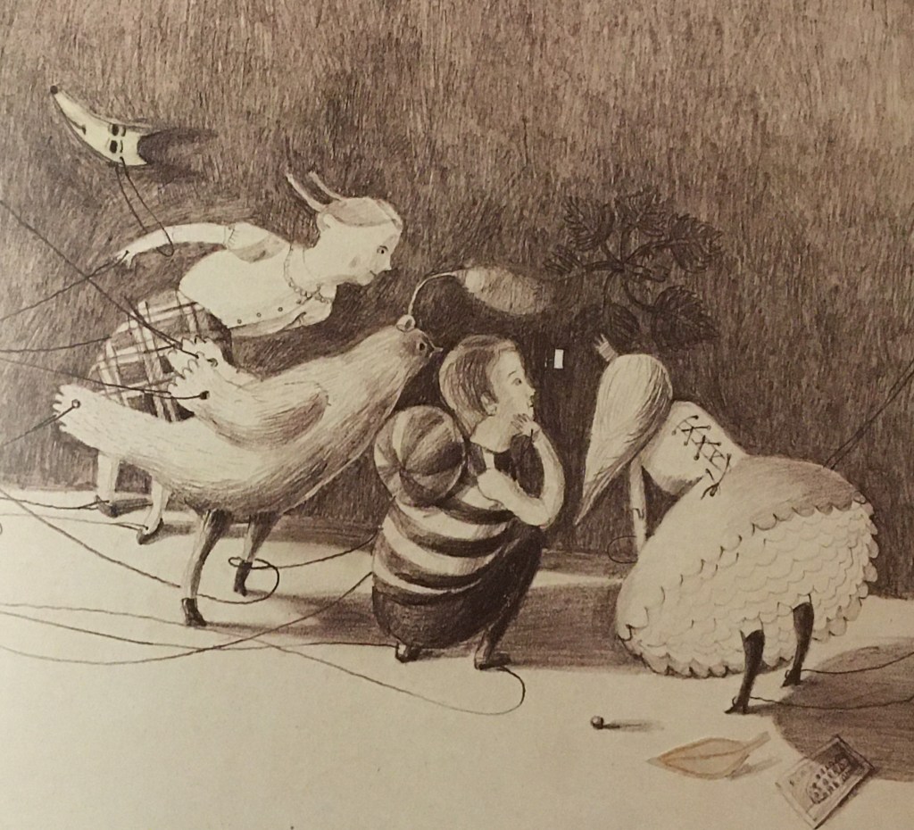 La délicatesse des illustrations de Joanna Concejo nous guide dans la mélancolie de la marionnette puis vers ses espérances pour l’indépendance. La couleur finit par éclater bras grands ouverts après les pages poétiquement grises et sépia. On voyage au pays des émotions avec les mots d’Arturo Abad, tantôt en mode spleen mélancolique, amour et douleur, stupeur et audace.