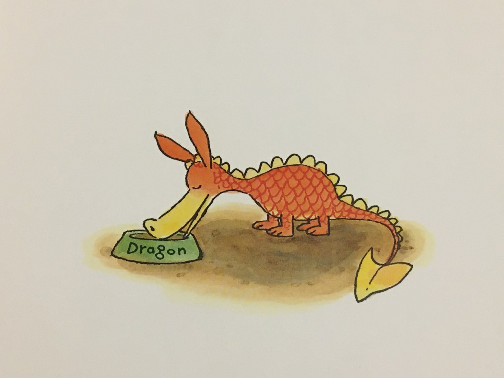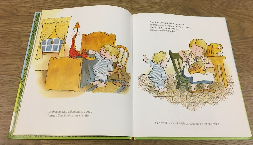 Les crêpes ça fait grandir les dragons vitesse grand V : à la fin du petit déjeuner le dragon est aussi grand que Madame Brindherbe. Il s’installe dans l’entrée pour faire une grande sieste. Il est devenu tellement grand que ça devient compliqué de circuler d’une pièce à l’autre sans passer par les fenêtres. Quand Benoît exprime son étonnement quant à la rapidité de croissance des dragons, ça mère lui cloue le bec en assenant à nouveau : « Les dragons ça n’existe pas ». Que répondre à ça ?