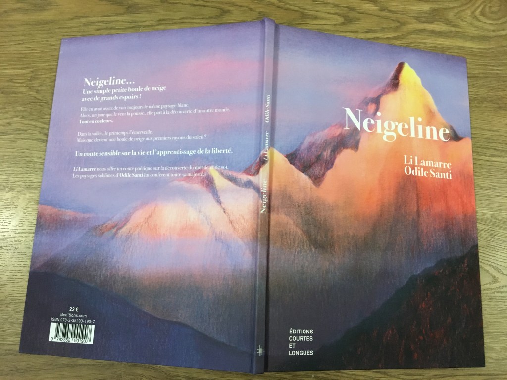 Ouvrez grands vos yeux, inspirez profondément pour découvrir cette œuvre de Li Lamarre et Odile Santi. On suit à travers les pages le parcours de vie d’une boule de neige, Neigeline, depuis la cime de la montagne jusque dans la vallée, où elle est précipitée un jour de vent. Bourrasque bénéfique qui réalise son souhait de découvrir un ailleurs en couleur, la chute n’en est pas moins effrayante. C’est le soulagement quand elle atterrit enfin en bas.
