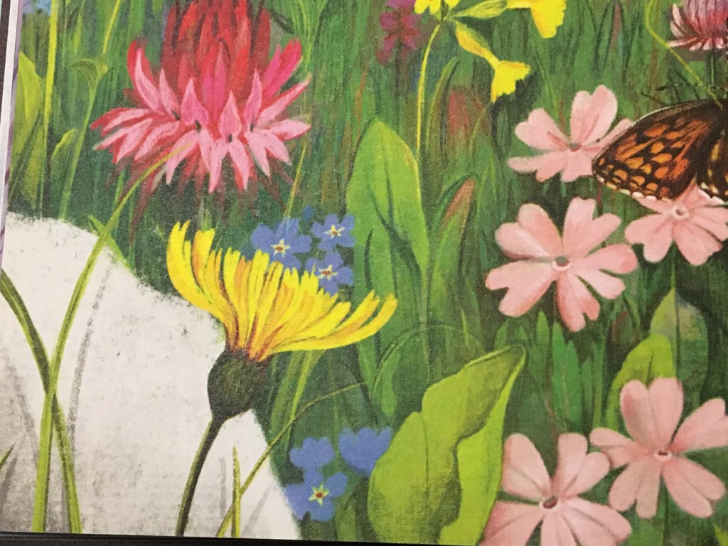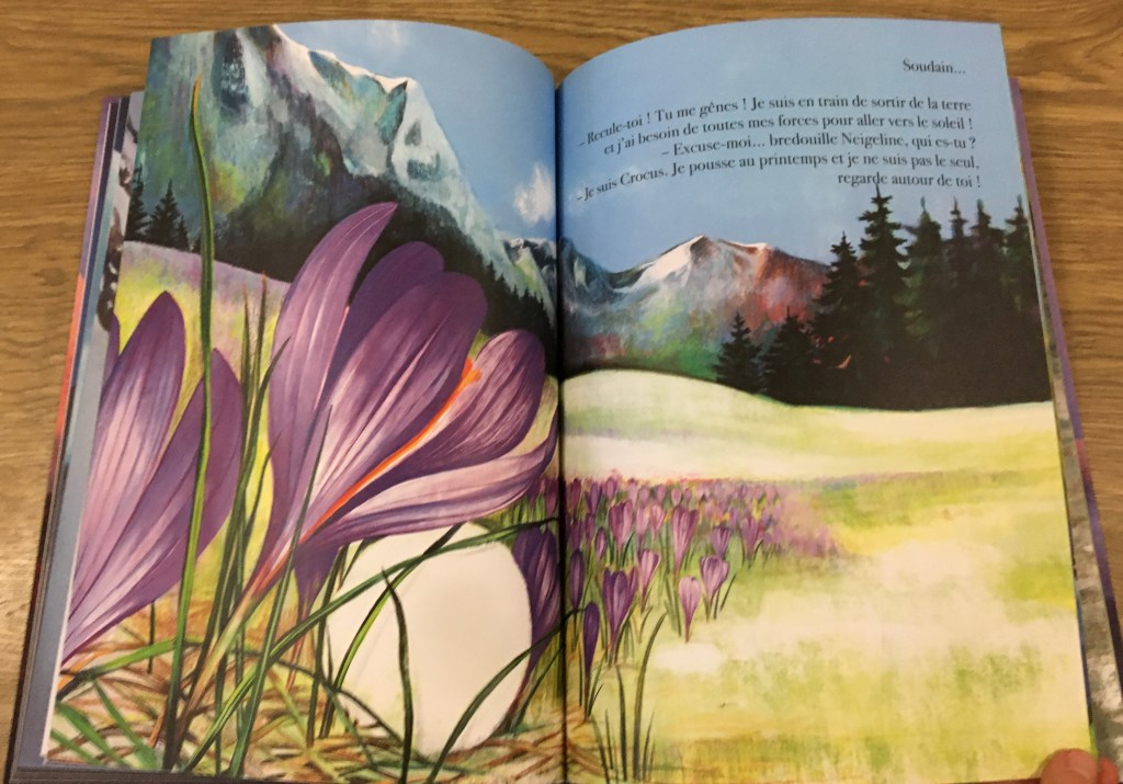 La nature est superbement montrée. L’observation des illustrations réveille des envies de se poser pour observer le vol des petits insectes printaniers, ou le balancement délicat des pétales dans la brise. Si je tends l’oreille peut-être que je pourrais percevoir la respiration de la vallée, le bruissement des arbres, la musique du ruisseau dans la magie de l’instant présent.