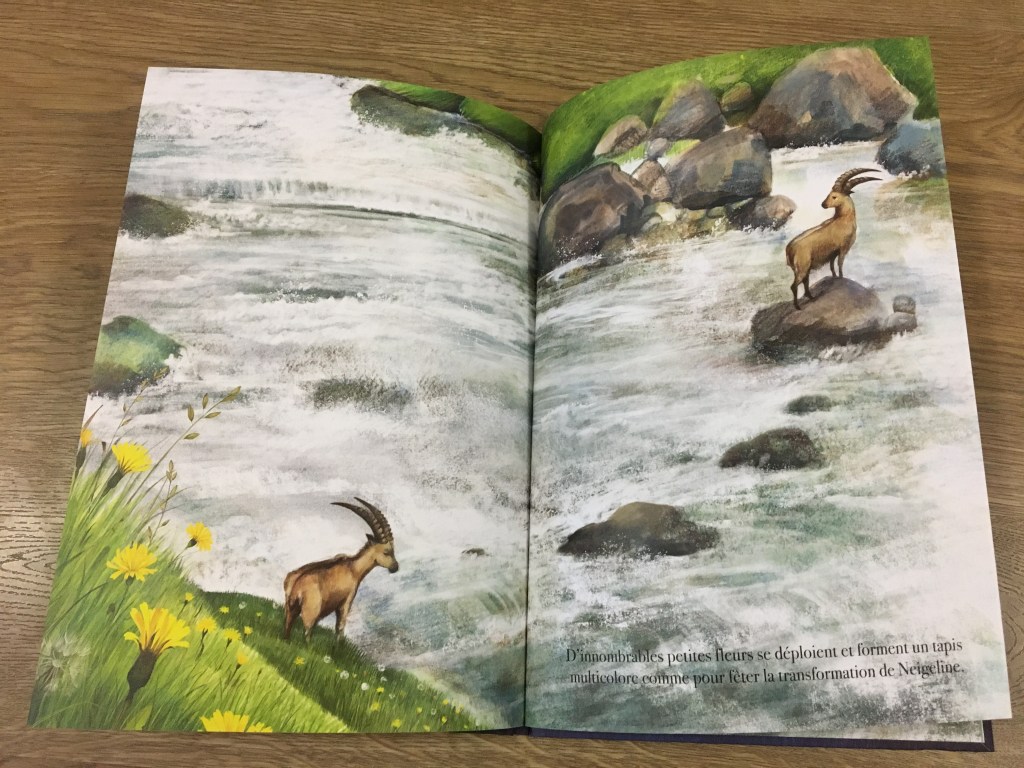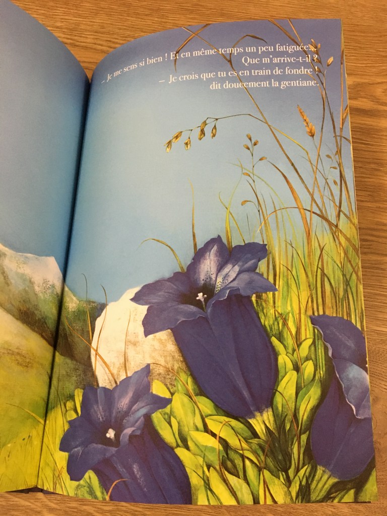 Les merveilleuses doubles pages paysages nous font pénétrer dans une montagne préservée, protégée, sereine. La marmotte succède aux animaux blancs, les crocus égayent les plaques de neige, l’hiver se retire doucement. Neigeline se sent différente. Elle aussi passe d’un état à l’autre. Bienveillance de la nature autour d’elle, elle assiste aux transformations : éclosion des fleurs, ballets des papillons, musique de l’eau qui est proche, si proche à mesure que le soleil darde ses rayons. Neigeline fond progressivement : une nouvelle aventure se dessine semble-t-il…une fin en début d’autre chose…