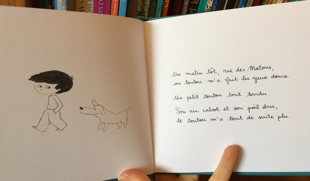 C’est une histoire tout en rimes, qui parle d’un enfant et d’un toutou. Ça commence par leur rencontre dans la rue. Rapidement l’enfant se dit qu’il lui manque quelque-chose de capital à ce toutou : il n’est pas assez poilu. Qu’à cela ne tienne, un petit traitement sur mesure et voilà le toutou couvert de longs poils, qui poussent, poussent, poussent encore. Diantre ça ne s’arrête plus ! Que faire de tous ces poils ?