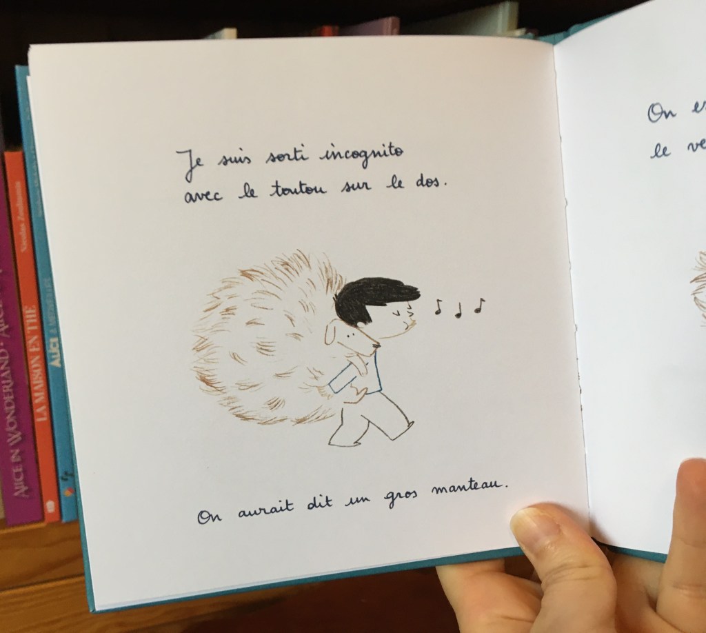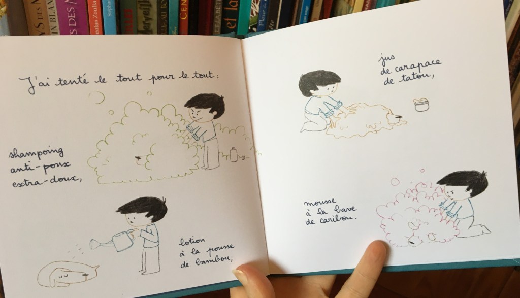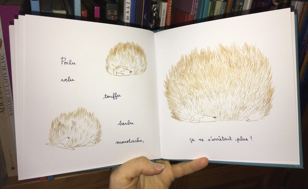 Au début la couverture ne m’a pas attirée. Mais j’étais franchement piquée, intriguée : y a quoi dans un livre poilu ? J’y ai trouvé une chouette poésie en prose, un vrai plaisir cette lecture : c’est drôle et goutu, ça donne envie d’inventer des histoires ! Le petit format du livre le rend attachant comme un petit animal de compagnie. Delphine Perret nous offre le texte et les dessins. Assonances et allitérations se succèdent de page en page avec un parfait dosage. Côté illustrations les traits sont fins, délicatement efficaces pour un résultat très amusant !