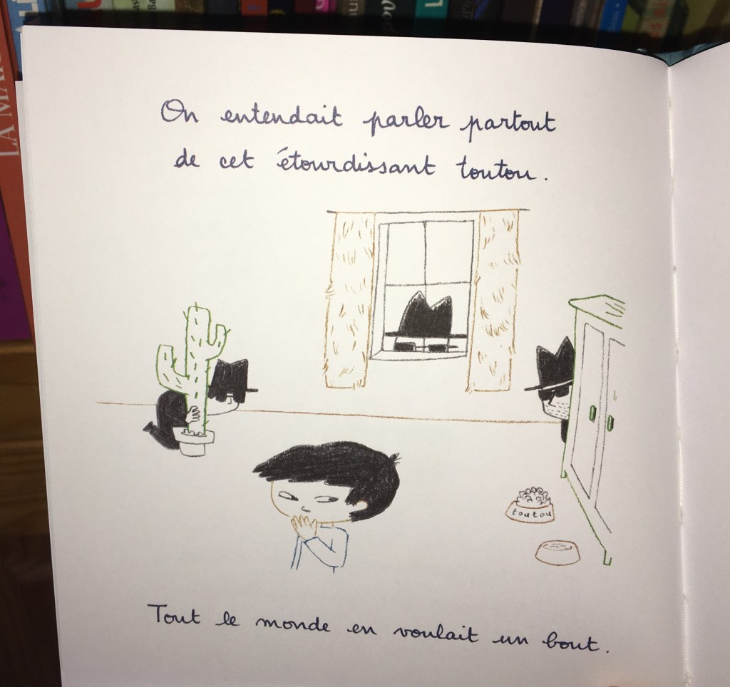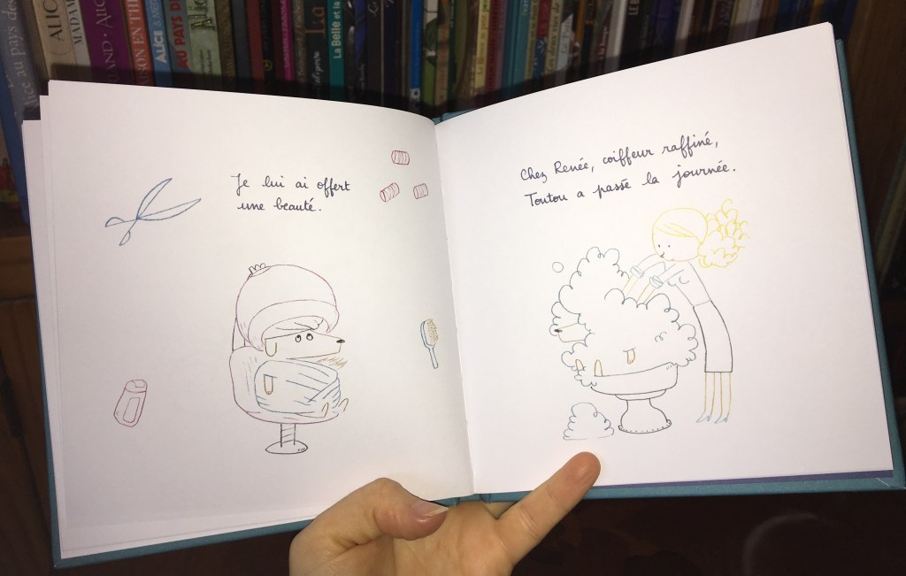 Le toutou hyper-touffu devient célèbre et l’enfant regrette le temps d’avant. Il cherche des solutions : un vélo, le toutou sur le dos les voilà partis à la rencontre de gens plein de talents…ou pas. Il ne semble pas y avoir de solution. Enfant et toutou rentrent à la maison et se font une raison. Jusqu’à ce passage chez Renée la coiffeuse, dont les talents en coiffure relèvent de la gageure…Quelle aventure !