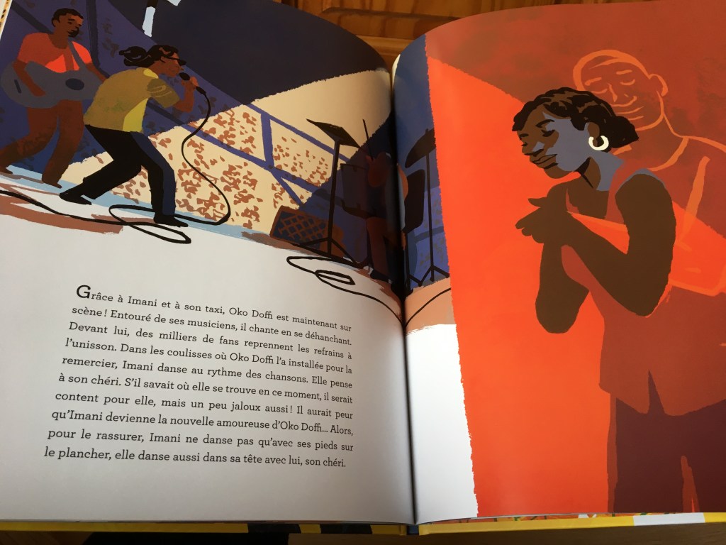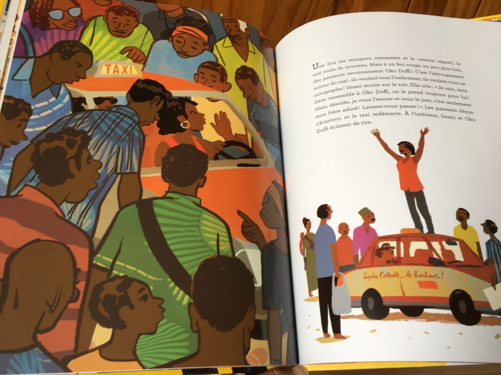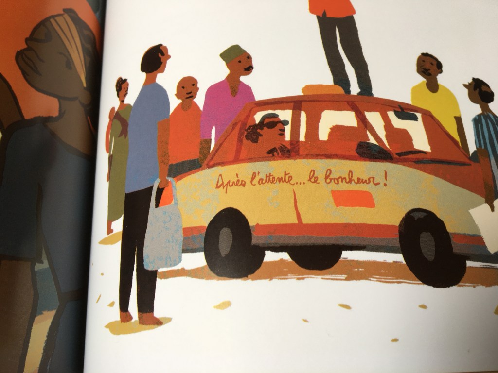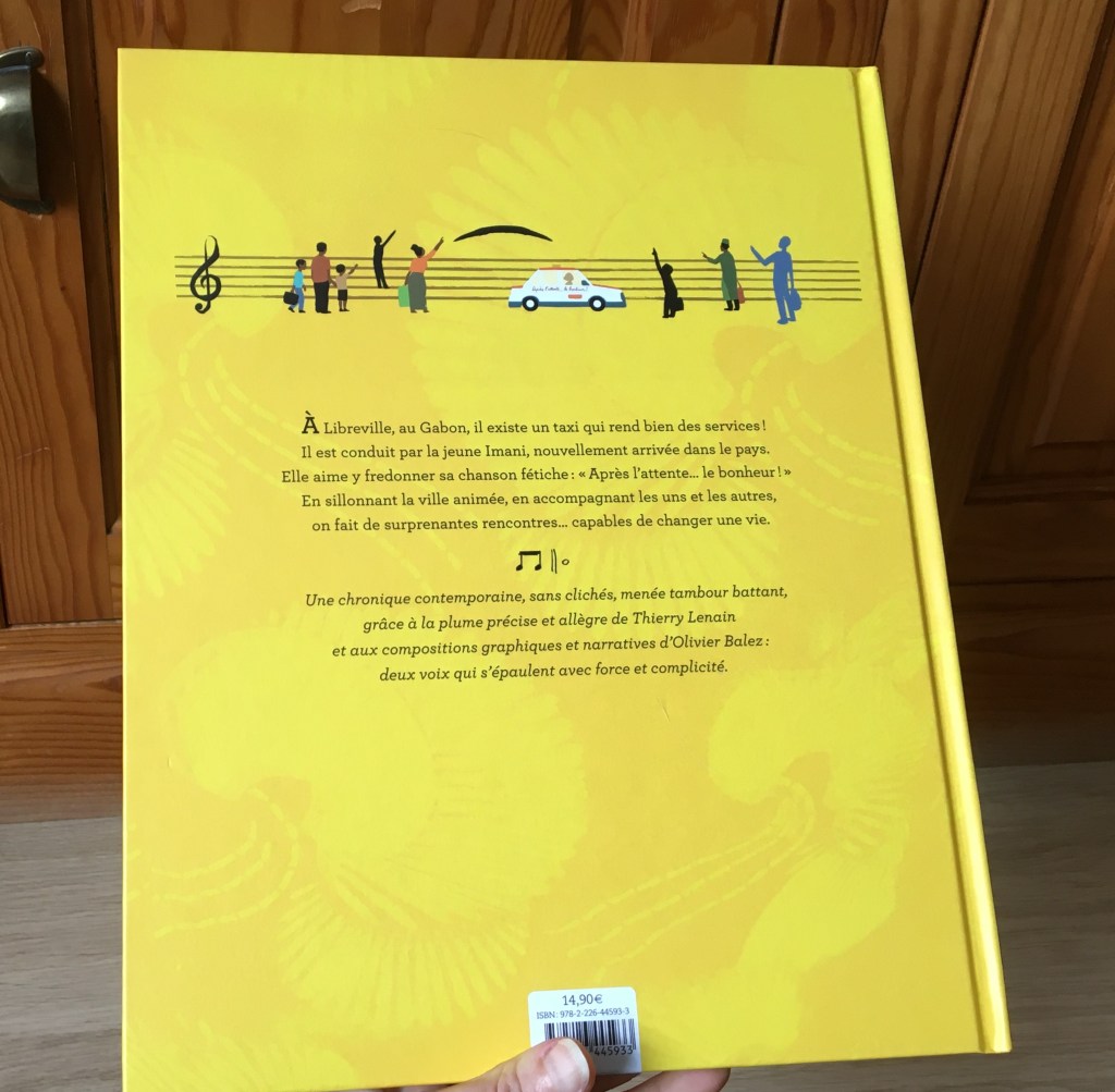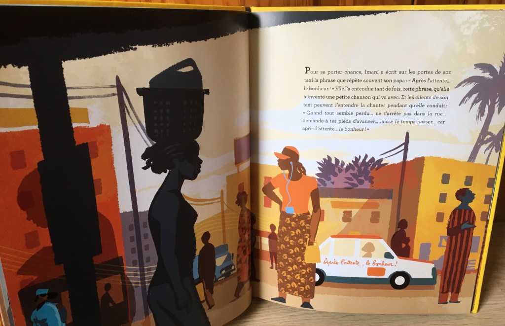 Voyage culinaire, ambiance vivante, fourmillante coloré : Thierry Lenain et Olivier Balez nous embarquent dans une Afrique sensorielle. Ça groove dans le concert, ça secoue sur la route, ça sent le poisson et le manioc au marché. Les couleurs explosent, chaudes pour accompagner le dynamisme d’une journée en taxi. La vie s’écrit au présent tant que le futur est lointain. Car songer au futur, c’est avoir conscience que les projets tant désirés ne peuvent pas encore se réaliser. Toujours Imani se rappelle : « Après l’attente…le bonheur !). Peut-être que tant qu’il y a de l’espoir, tout reste possible…