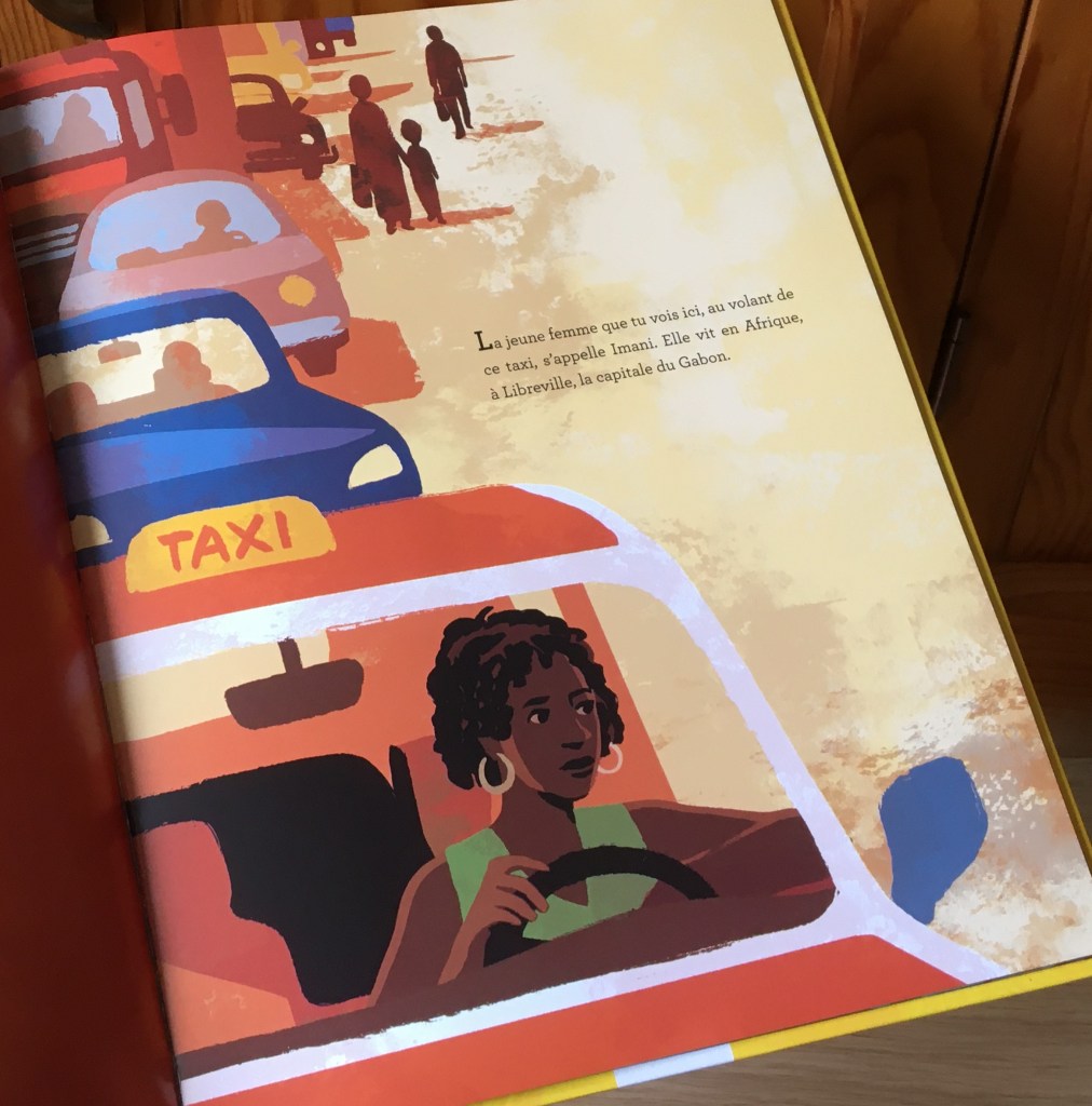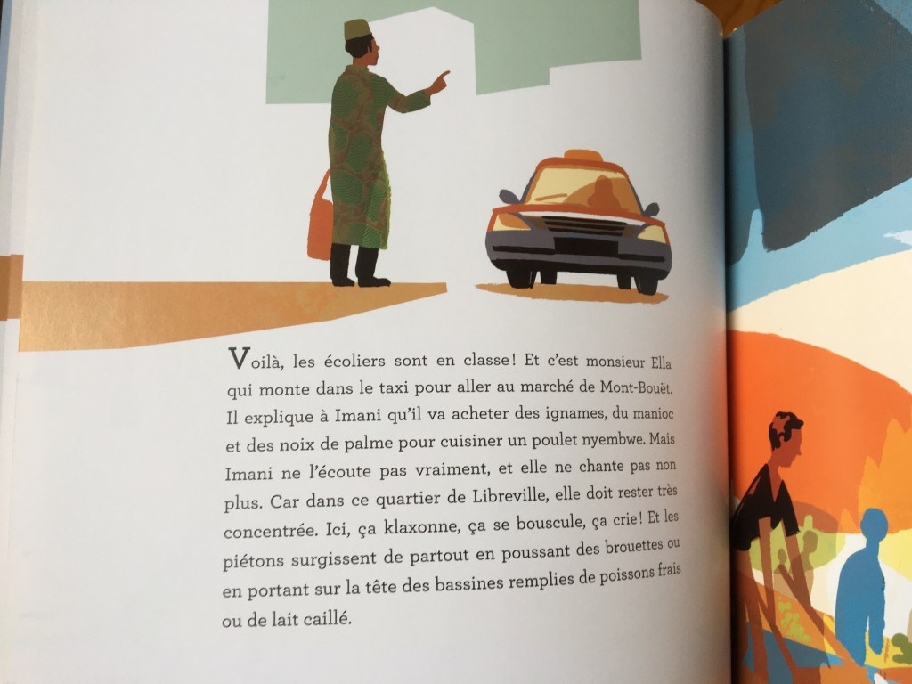 Jour après jour, Imani conduit les gens vers toutes sortes de destinations. Il y a les touristes et les habitués : Madame Siby à l’aéroport, les enfants à l’école ou au marché pour que Monsieur Ella puisse acheter de quoi préparer un poulet nyembe. Conduire au Gabon c’est un sport : les routes son pleines de trous, il faut être en concentration maximale à chaque instant pour éviter les accidents. Certaines courses sont plus dures que d’autres mais Imani est philosophe « Celui qui désire la pluie doit aussi accepter le boue » : c’est encore une phrase de son papa.