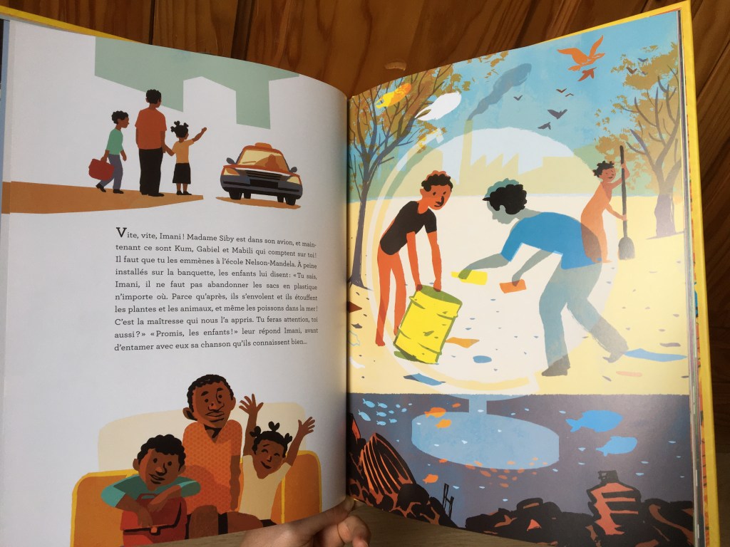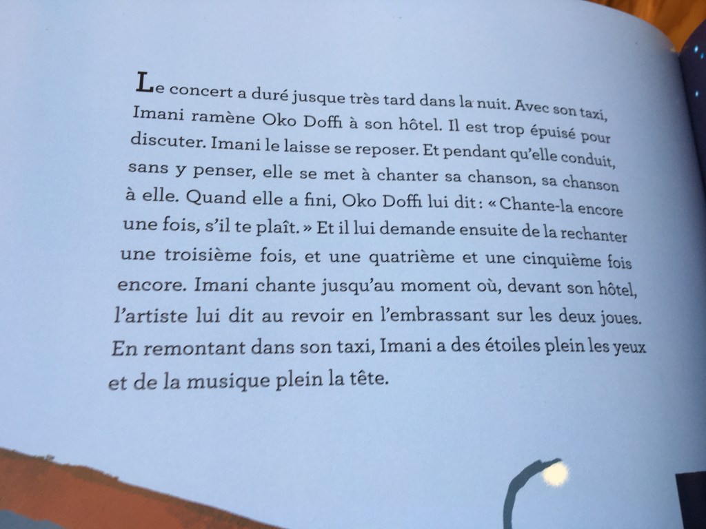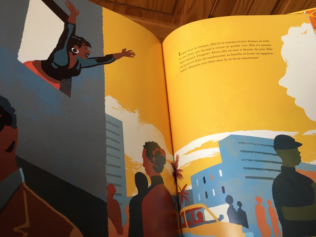 Partir pour choisir sa vie. Imani est une jeune femme qui, en fuyant son pays d’origine fait un choix audacieux. Elle quitte famille et amoureux pour arriver à Libreville chez une amie. (Si c’est pas hyper courageux…)Elle a peu d’argent en poche. C’est une situation pour le moins précaire. Elle a conscience que pour arriver à une vie meilleure, il ne va pas falloir ménager ses heures de travail. Sa façon de garder le moral c’est via la phrase de son père, et la petite chanson qu’elle a inventée pour l’accompagner. Chanter pour se donner du courage, chanter pour arroser les graines d’espoir, chanter ça la porte, Imani. Et les enfants chantent avec elle !