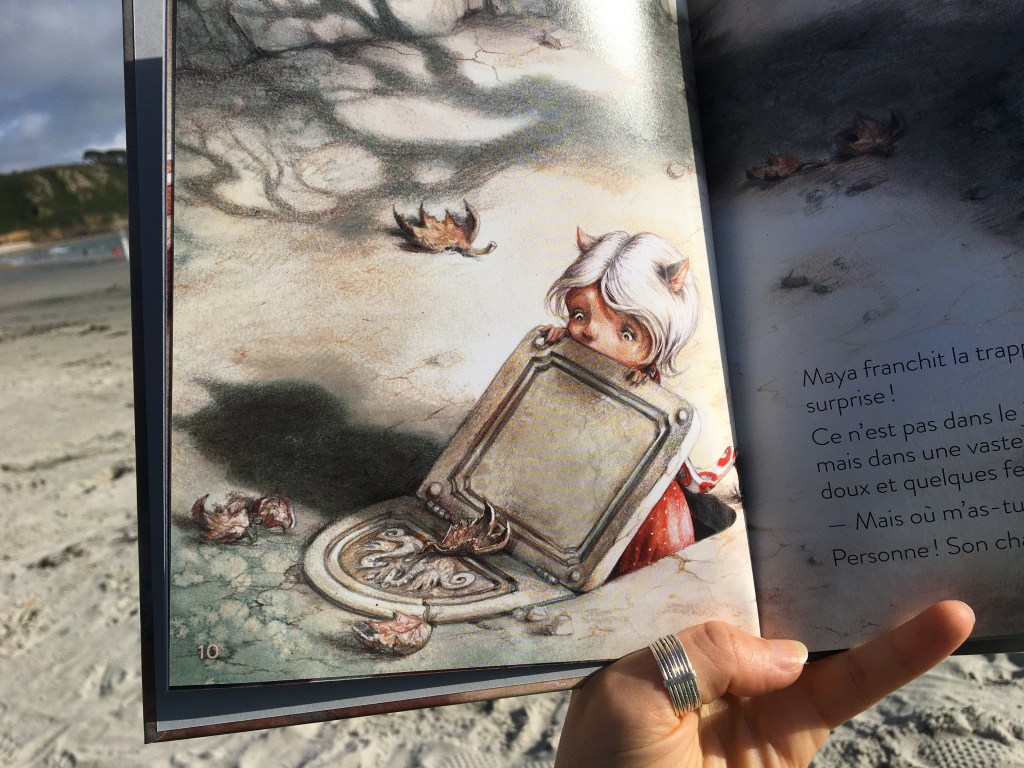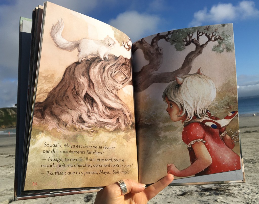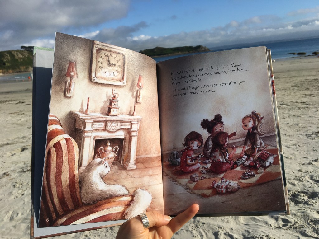 C’est bientôt l’heure du goûter pour Maya et ses amies. Un miaulement de son chat blanc (ah oui, pas de lapin ? ) et voici Maya détournée de ses amies pour le suivre. Sortir par la chatière : rien de plus simple. Et arriver dans une cour via une trappe : normal. De fillette devenir soyeuse et agilement féline : pourquoi pas !