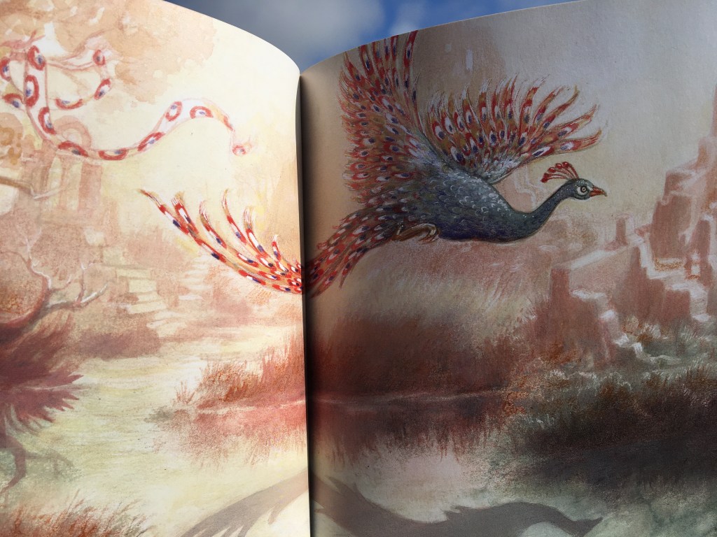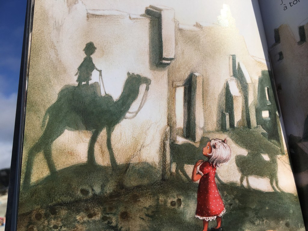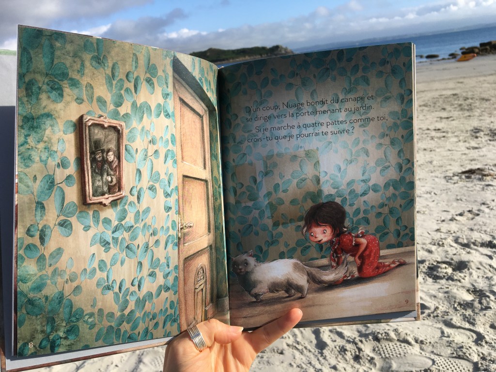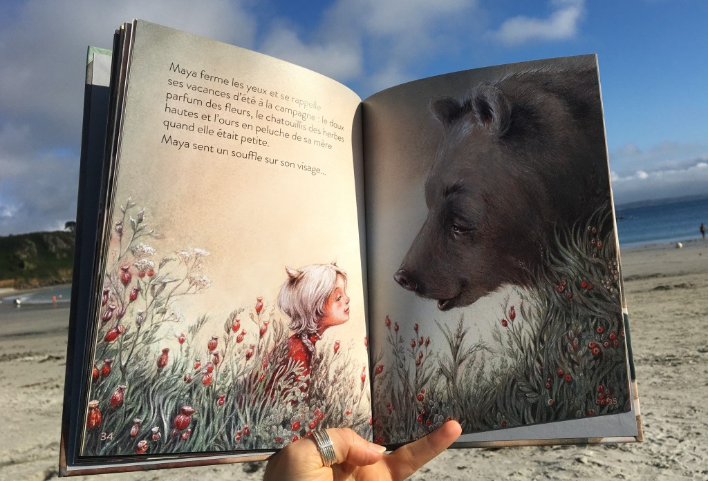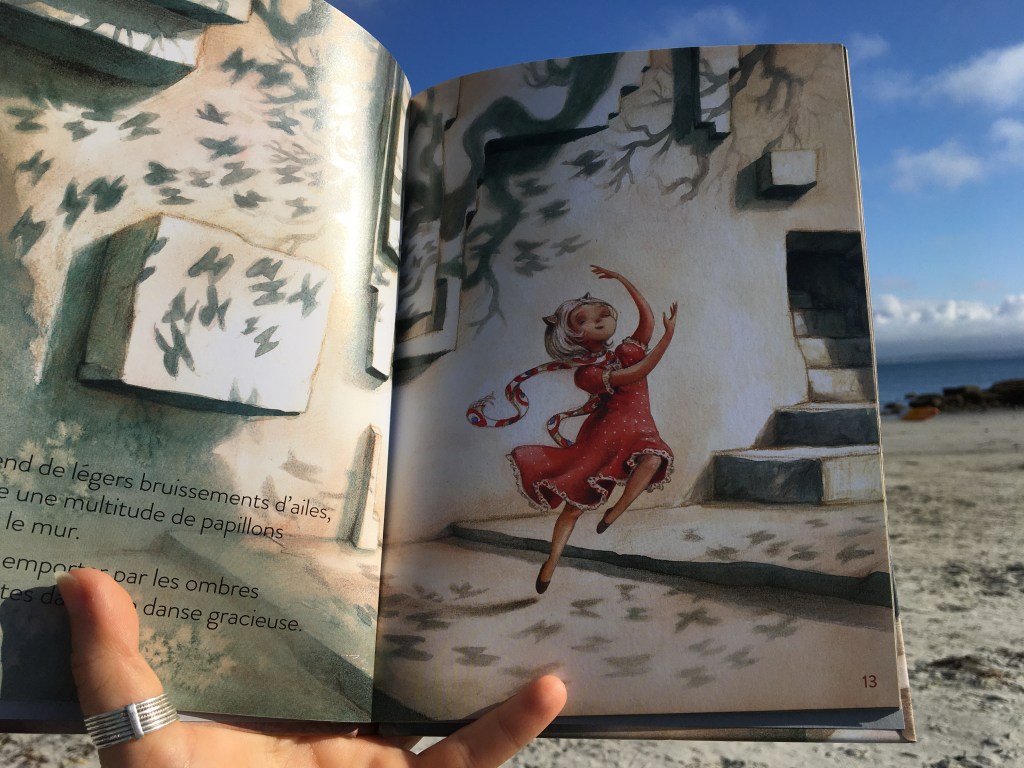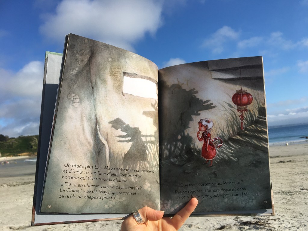 Dans cette douce après-midi d’été, Maya s’amuse ou s’effraie des ombres qui ne sont pas toujours ce qu’elles semblent être, ou paraître. Le grizzli devient banc dansant de carpes koï. Quand la tête lui tourne, Maya se retrouve assise dans une tasse de thé. Les effluves sont enivrants et il est temps de quitter le costume félin pour s’envoler, devenir paon, voir le monde d’en haut, et redescendre doucement dans les souvenirs agréables des vacances passées. Les sens se réveillent, se réactivent, les joies simples du moment présent deviendront bulle précieuse, tranches de joies simples comme le souffle du chat contre son visage.