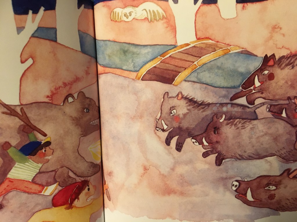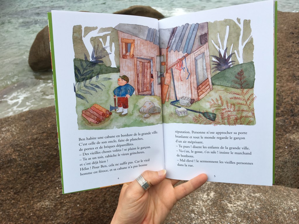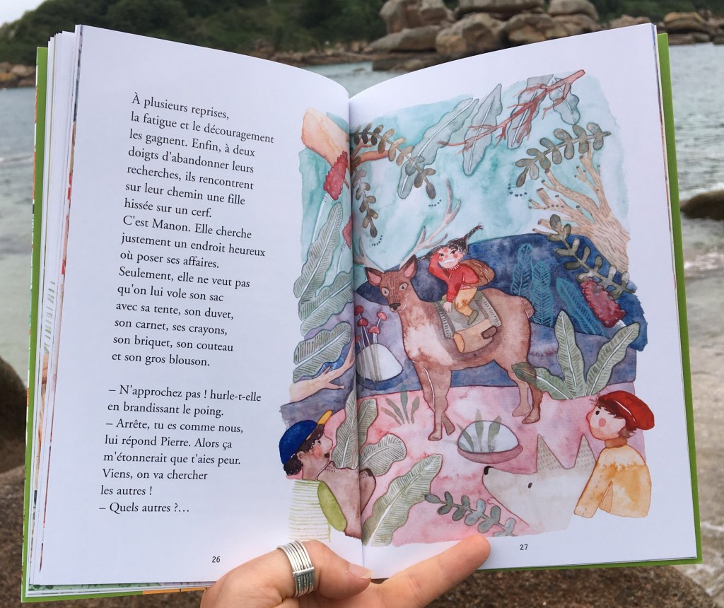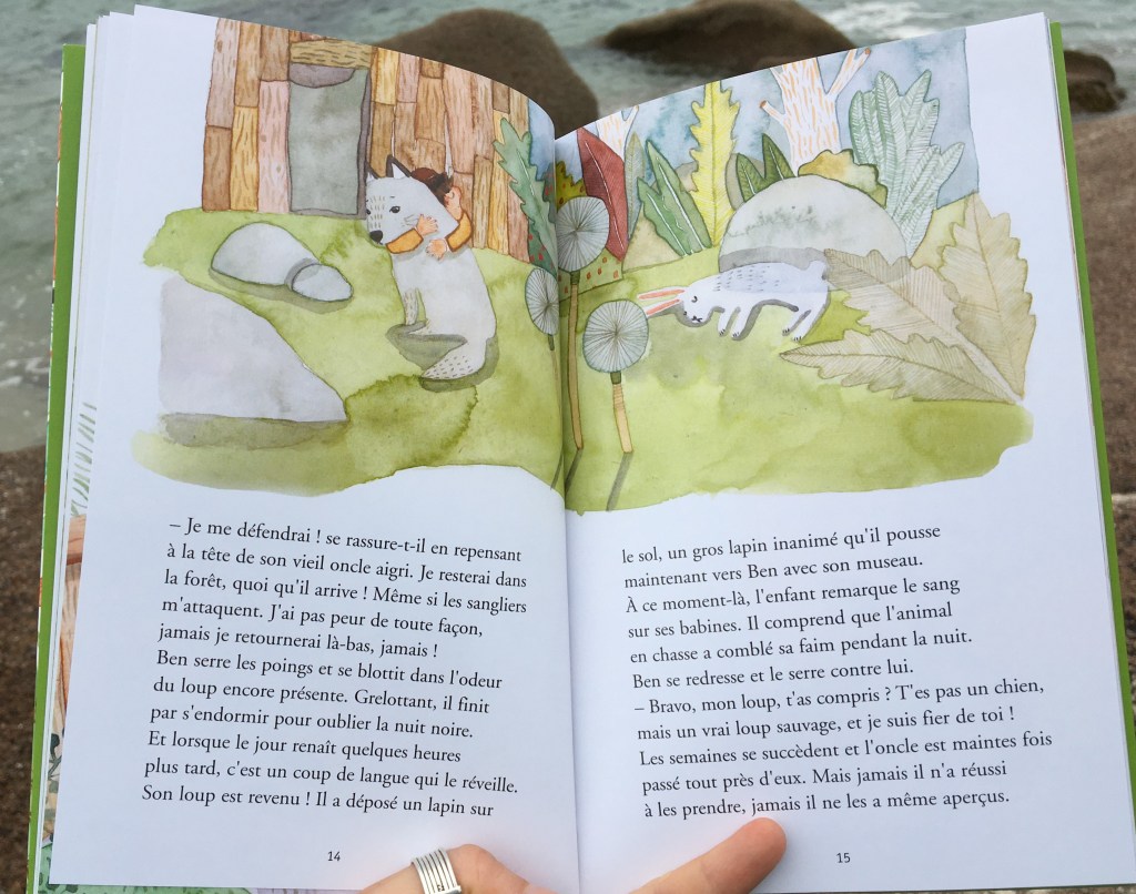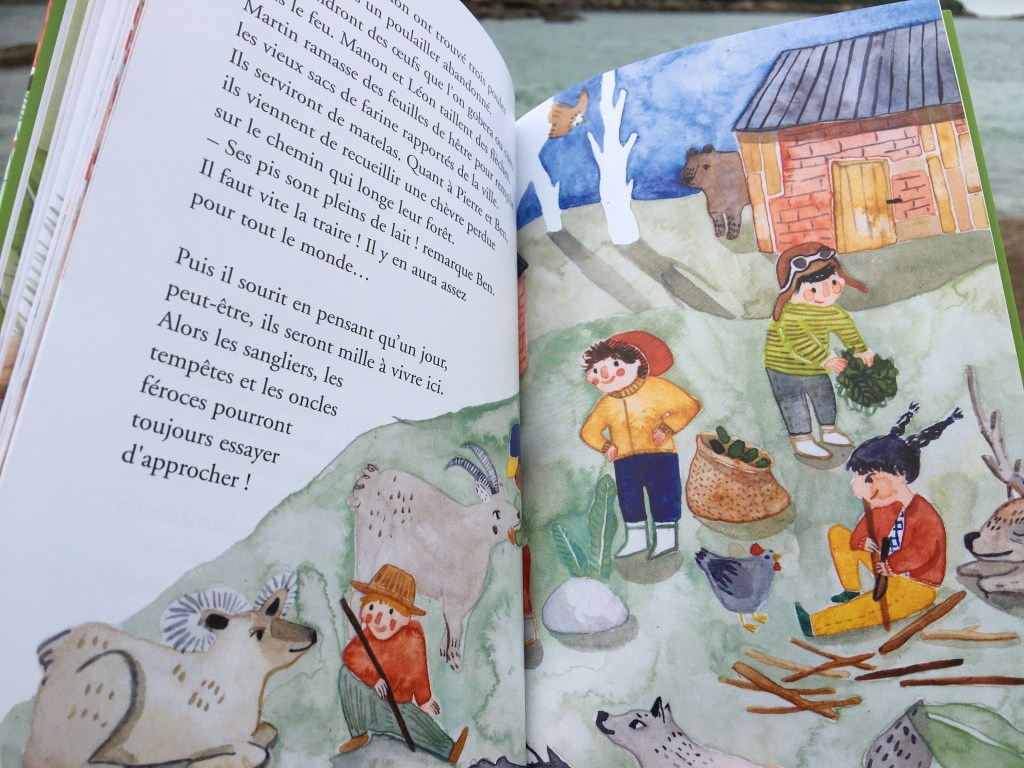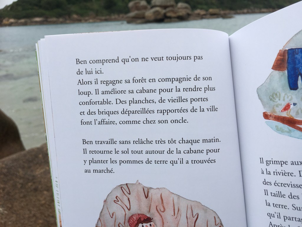 Raphaële Frier nous offre une histoire de courage. Ben largue les amarres de la triste vie qu’il mène avec son oncle. Ce n’est pas évident de partir, de quitter l’enfance même si celle-ci est malheureuse. L’enfant part de rien, avec rien. Il doit tout construire, semer, apprendre à pêcher, se protéger, se cacher s’il veut préserver sa liberté. Il apprend à faire fi du regard des autres. Il prend confiance en lui. Il s’affirme sans s’isoler car quand il rencontre un autre « comme lui », il sait le reconnaître. Solenn Larnicol illustre en délicatesse la forêt, les épreuves, cette bande d’enfants et d’animaux. Il y a moult détails aquarellés à observer et quand même : ils n’ont pas l’air commode les sangliers !