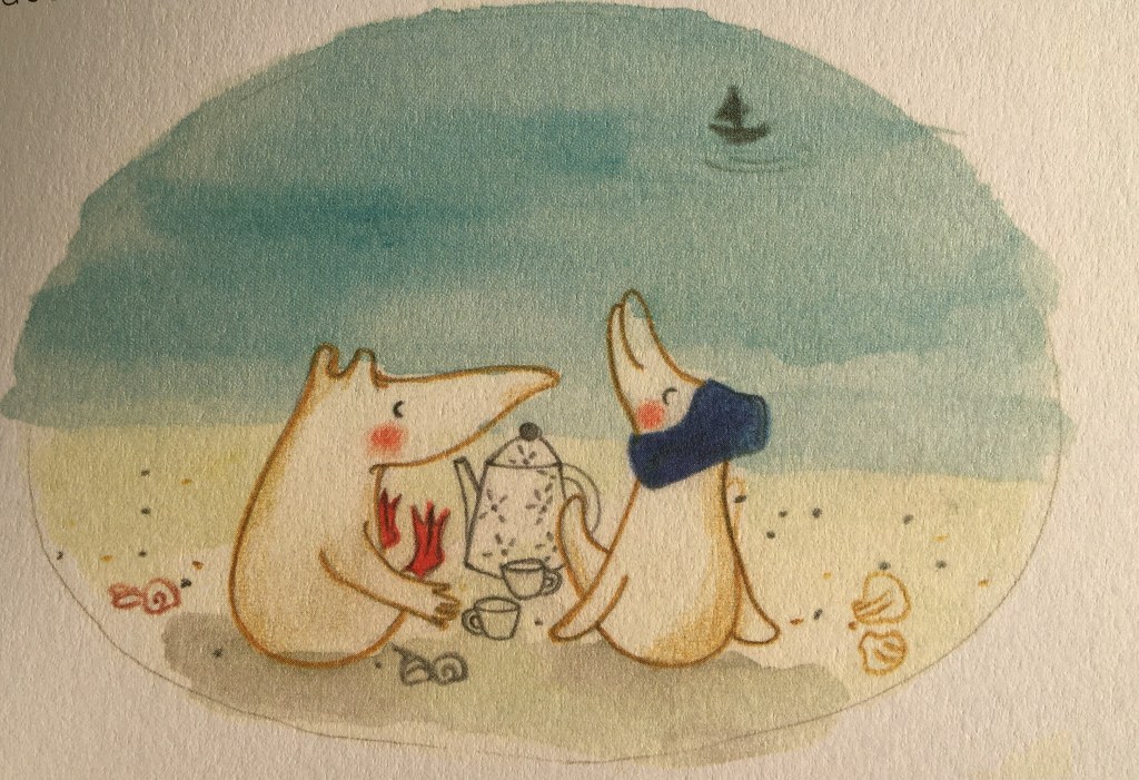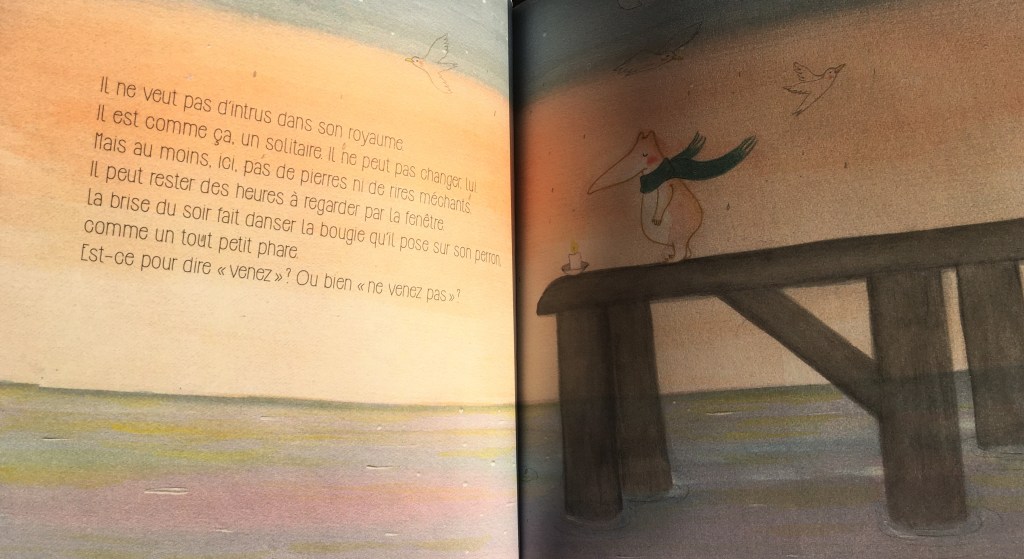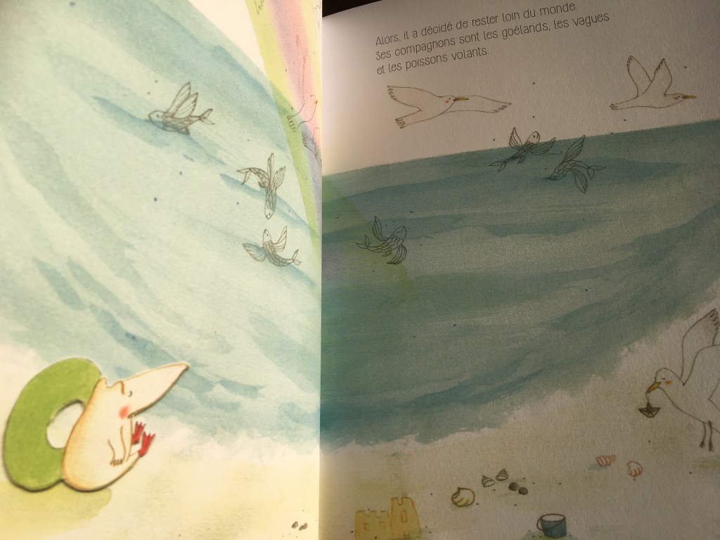 Avec la délicatesse qui les caractérisent, l’une aux mots l’autre aux pinceaux, Marie Tibi et Baptistine Mésange nous offrent un album habile et subtil. Hoel est cerné par un océan d’émotions, et son vague à l’âme trouve l’apaisement dans l’incessant ressac. S’il est rassurant en apparence, au fond le sentiment de solitude pique et Hoel sent bien au fond de lui que la situation devra changer, un jour…peut-être…sûrement…mais ça lui fait peur. Se confronter au monde : pas question ! Par contre si le vent tombe et laisse Ahé sur l’île, c’est différent…Certaines rencontres s’imposent d’elles-mêmes, pour le meilleur…