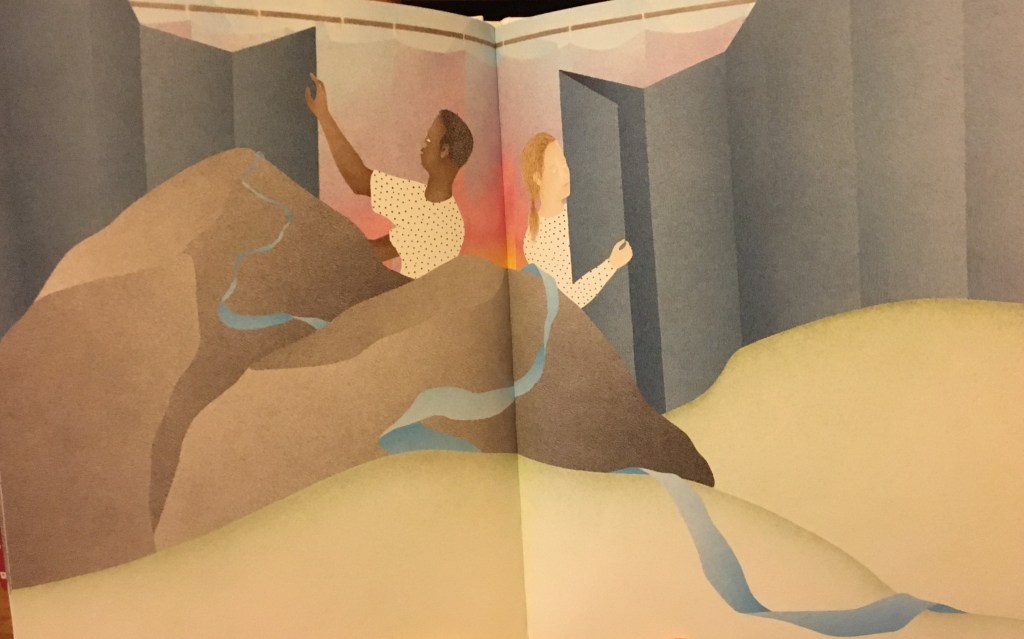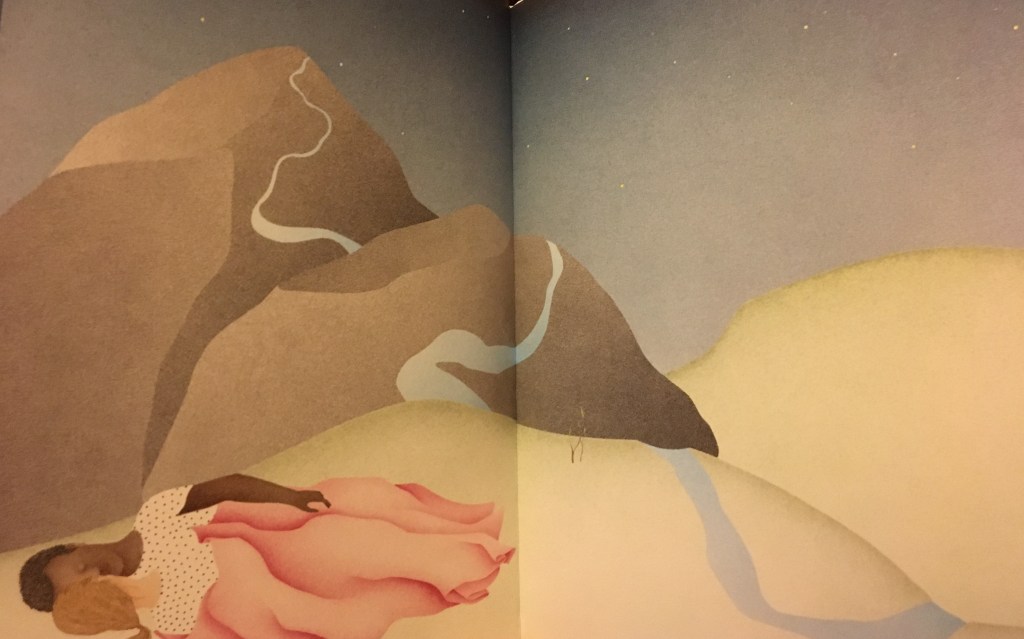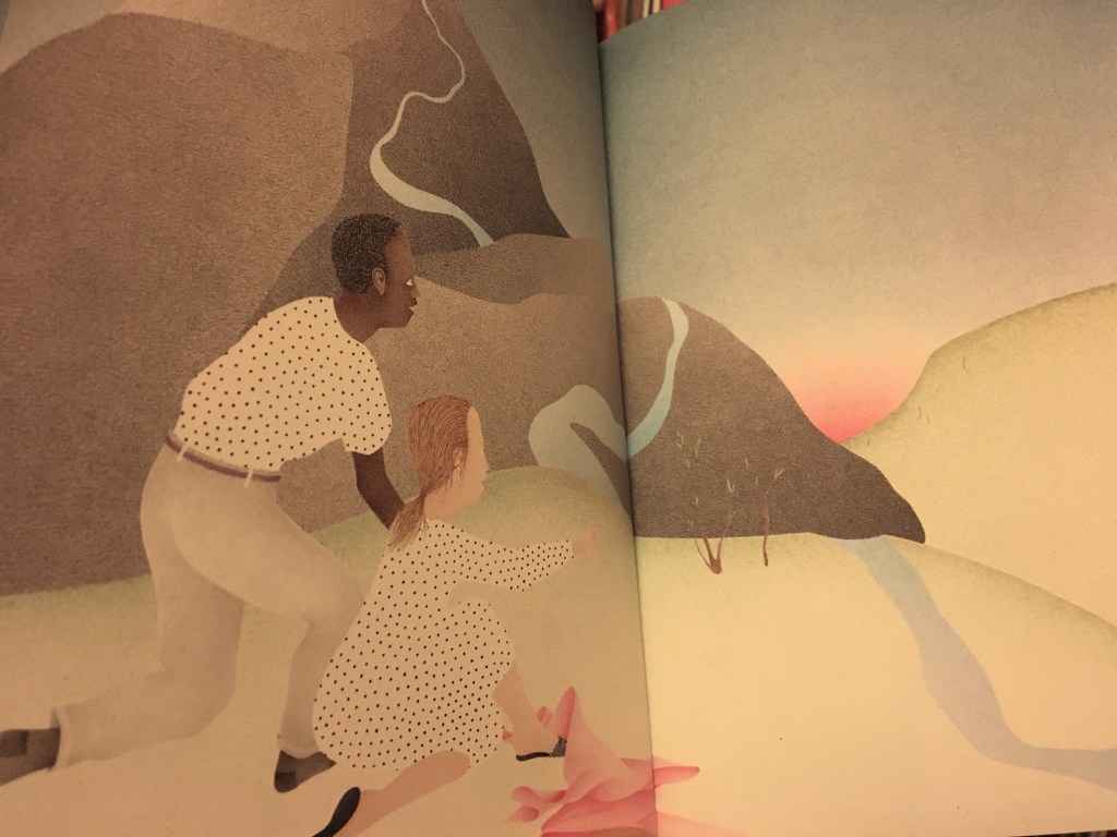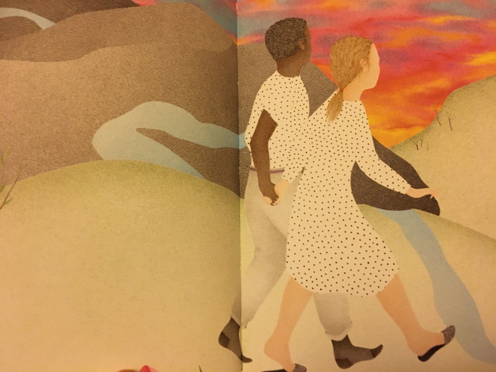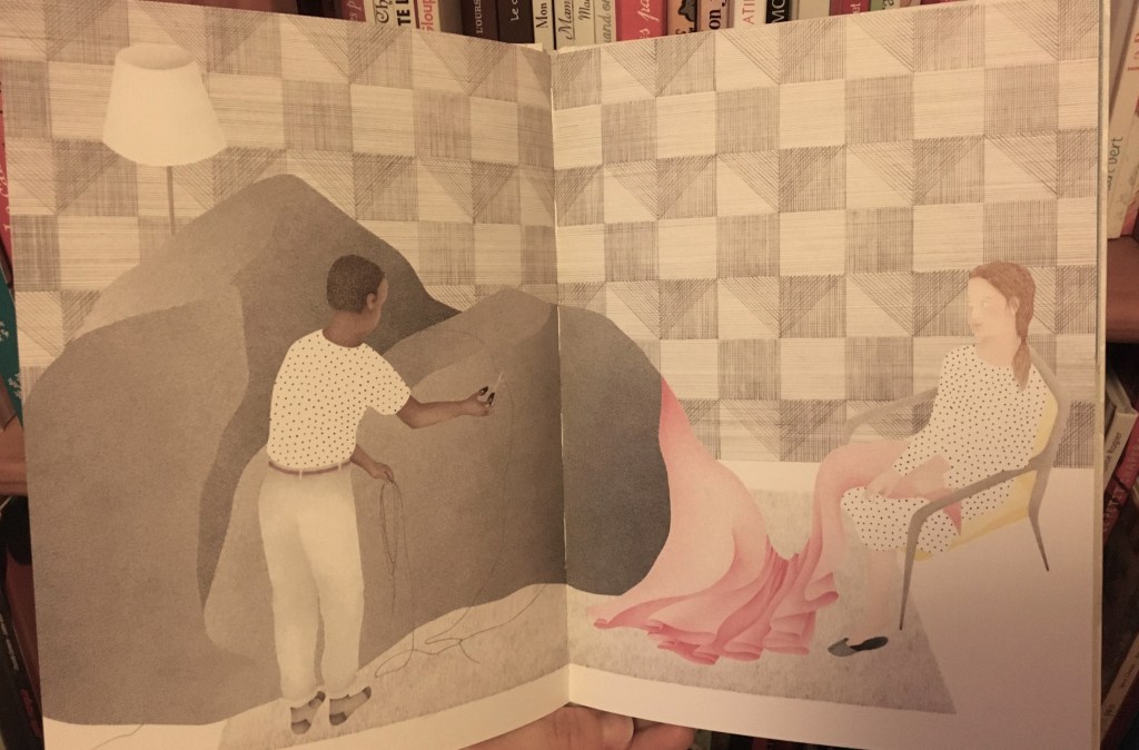 Entre sobriété et délicatesse, la poésie est partout et la tendresse évidente. L’album est en fluidité, comme cette étoffe rose qui glisse pour revenir en couverture de nuit. Tout coule de source, tel ce ruisseau qui part du mont pour devenir rivière. Avec une énergie commune l’homme noir et la femme blanche organisent, bricolent, installent, déplient, réalisent ensemble. D’ailleurs je crois que c’est le maître mot « ENSEMBLE » …pas main dans la main en permanence car ça ne serait pas très pratique pour manier le marteau, mais l’essentiel est là. Les yeux sont tournés vers le même horizon…