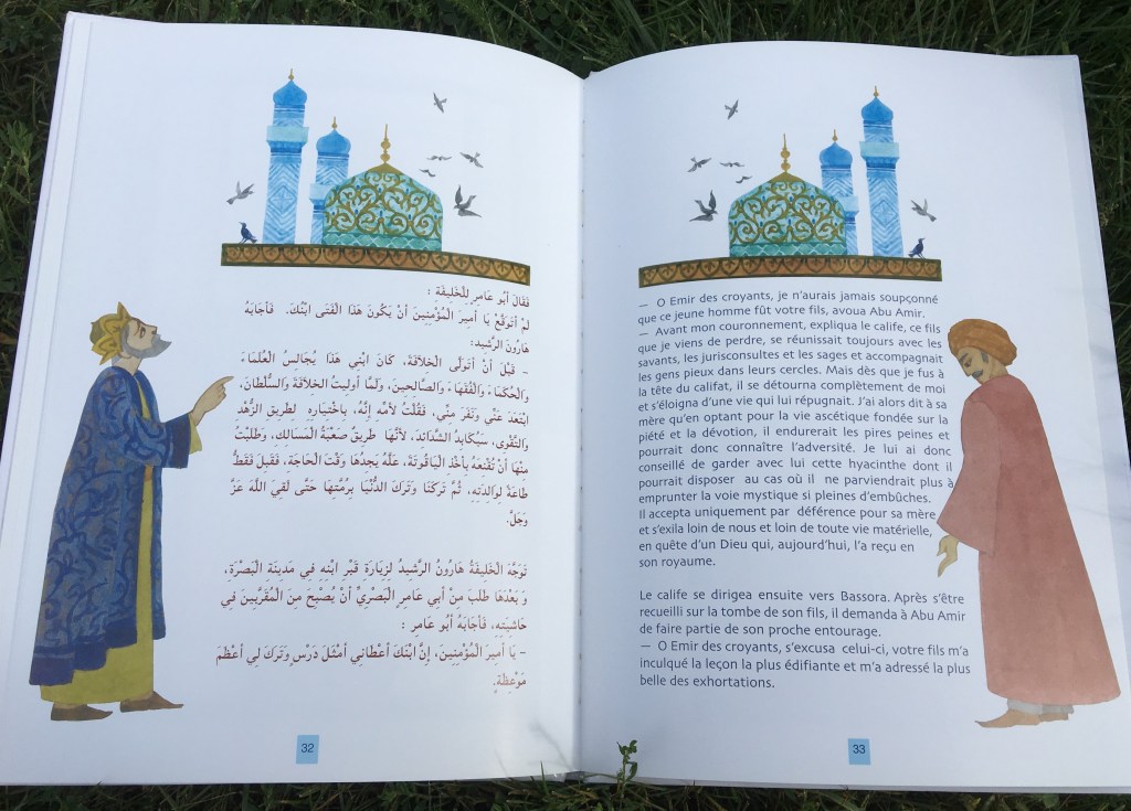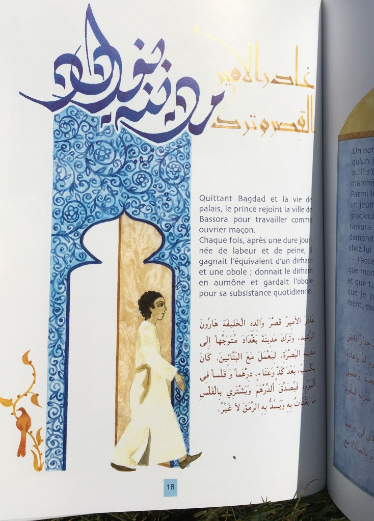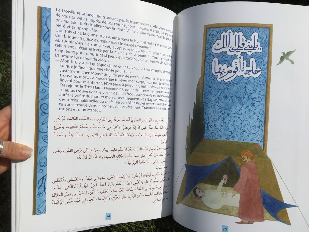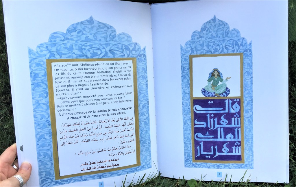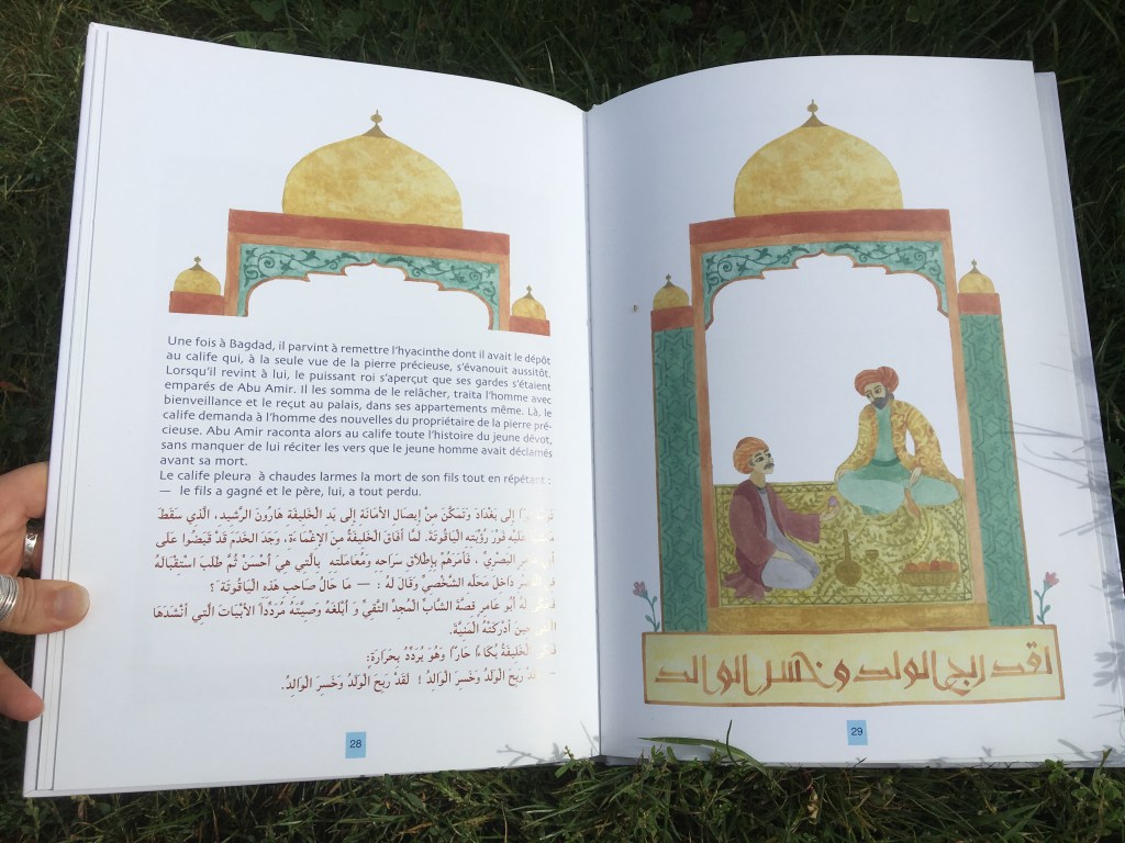 Une autre dimension nous attend dans ce conte : un dépaysement merveilleux qui est conduit par les illustrations délicatement persanes de Françoise Joire. Arabesques et écriture arabe participent à poser l’ambiance orientale tantôt somptueuse, tantôt humble. L’album est bilingue : français et arabe se côtoient comme une évidence.