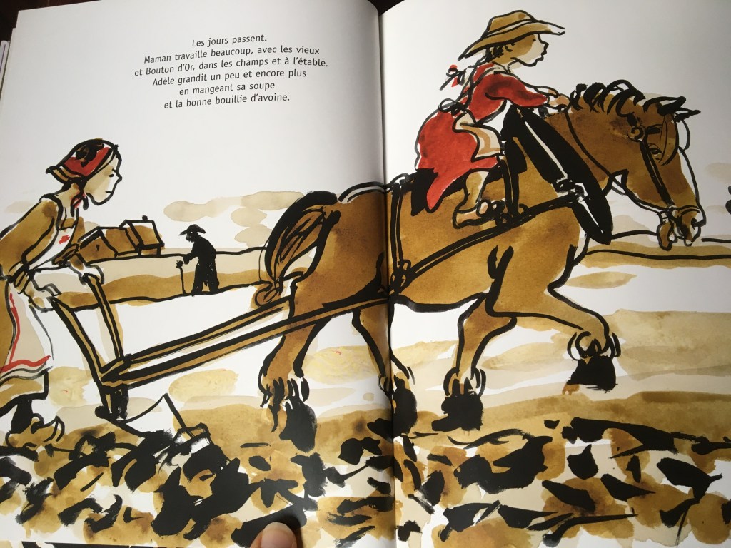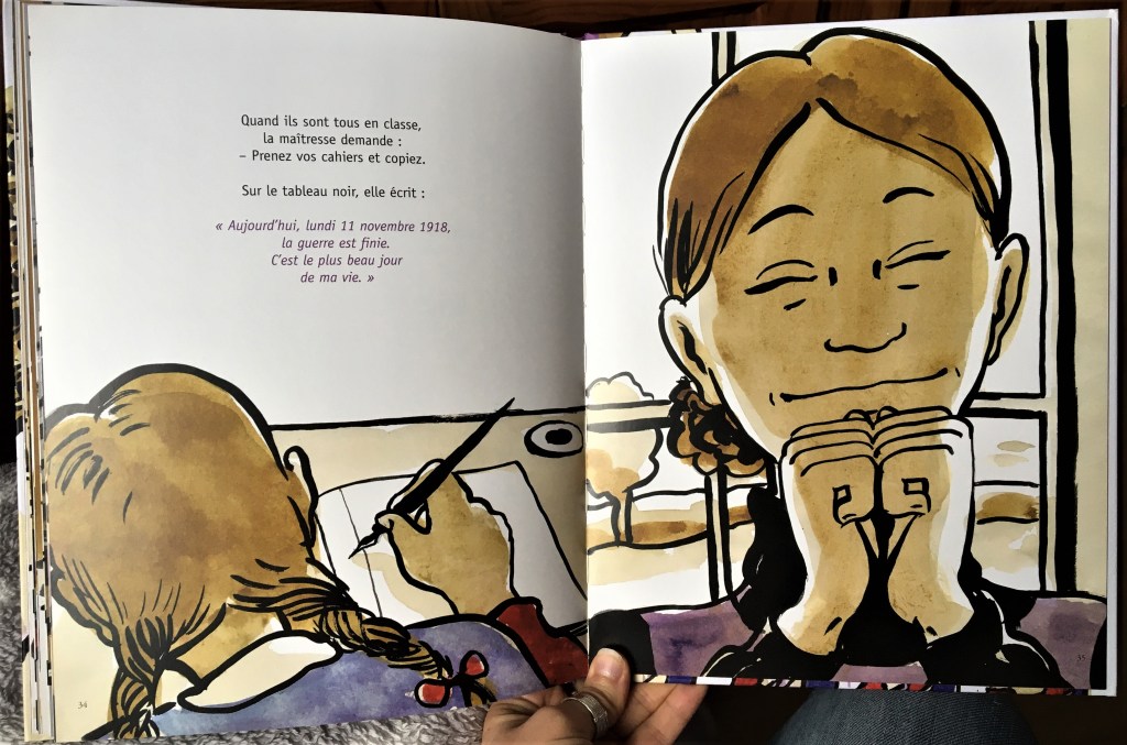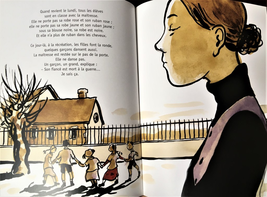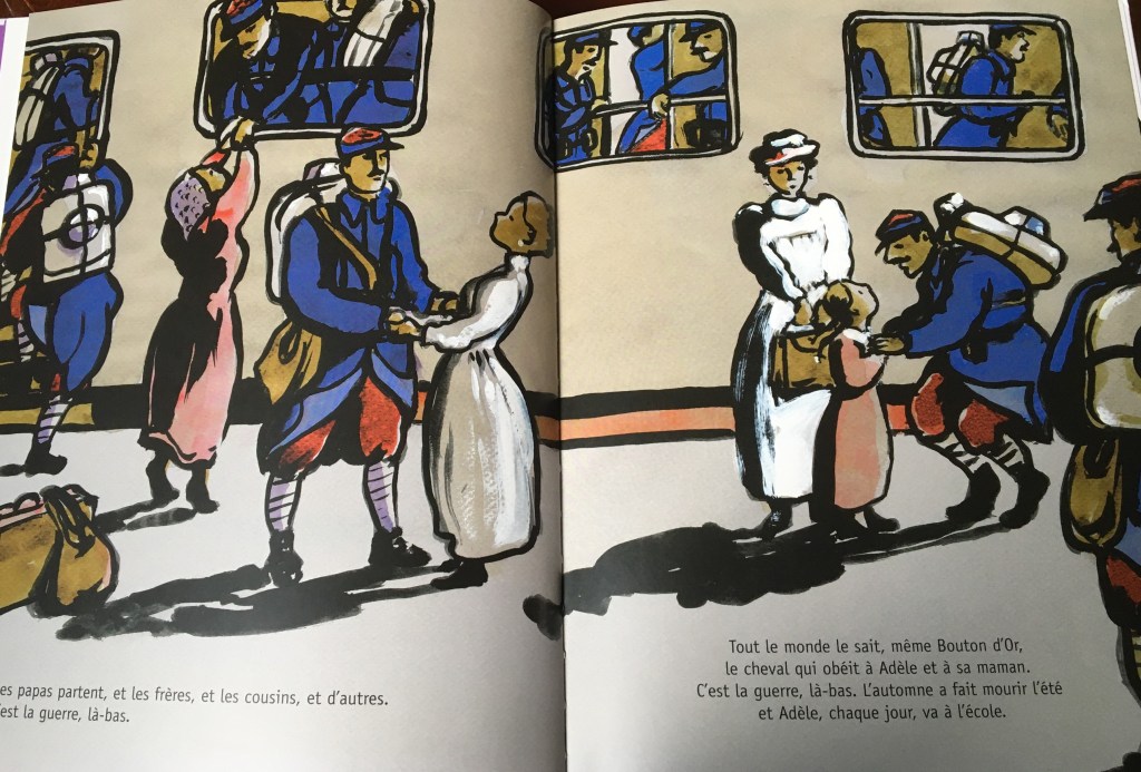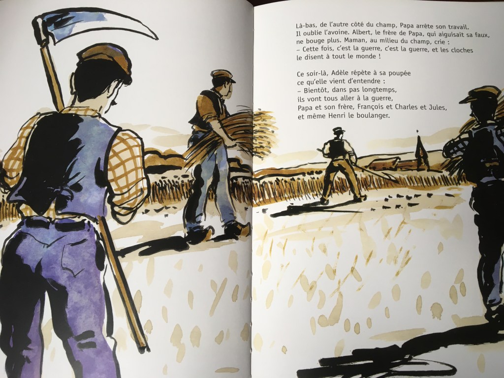 Je m’interroge souvent : comment parler de la guerre aux enfants ? Comment leur expliquer que dans notre Histoire il y a ces parenthèses d’enfer ? Sans être frontal, Yves Pinguilly passe par les yeux d’Adèle pour en parler. L’enfant raconte les étapes, les cloches, le départ, les vêtements noirs de la maîtresse, les vêtements noirs de son amie Yvonne. Zaü aux illustrations montre ce que l’enfant ne voit pas : les uniformes, les larmes de la maîtresse, les tranchées et les blessés.