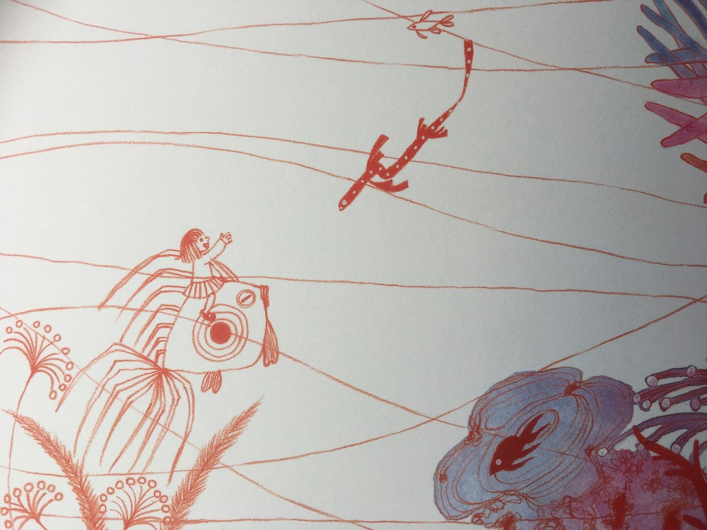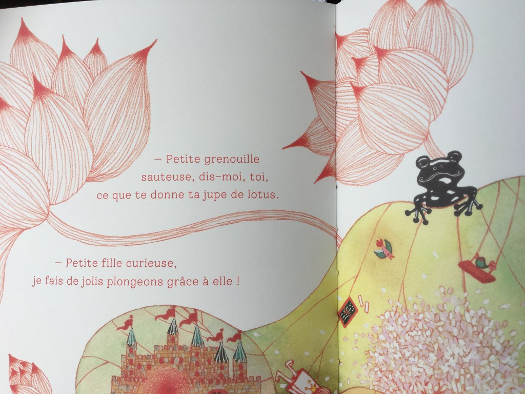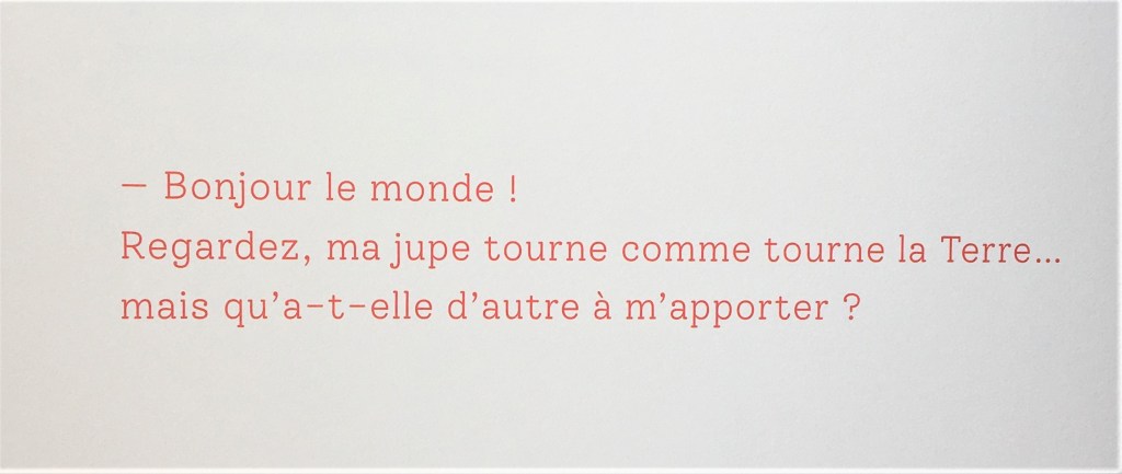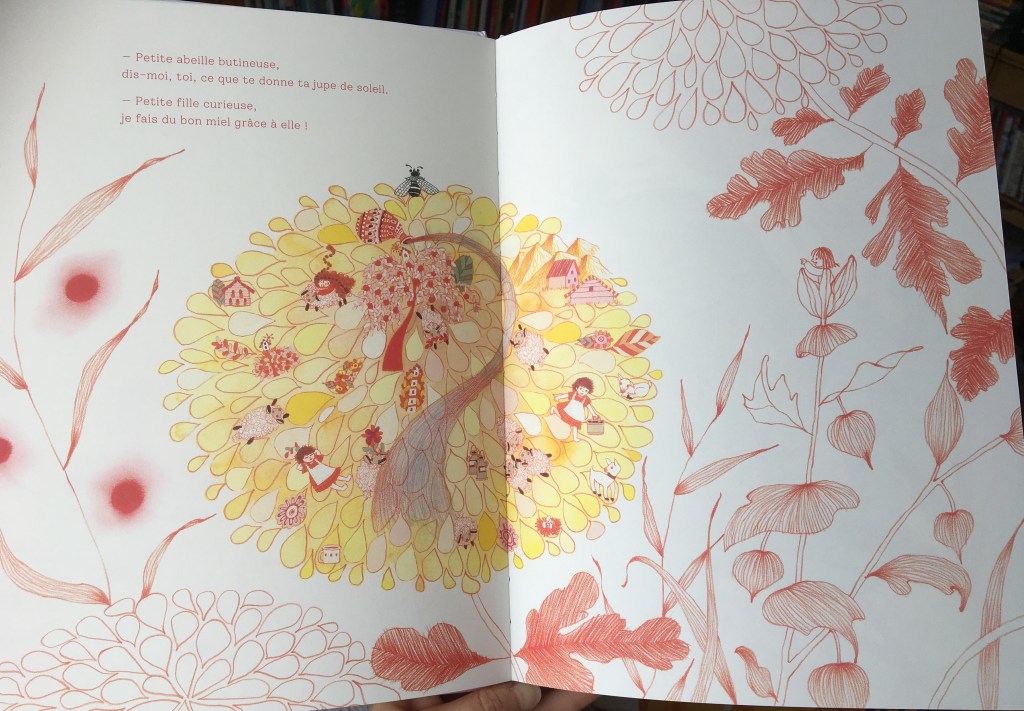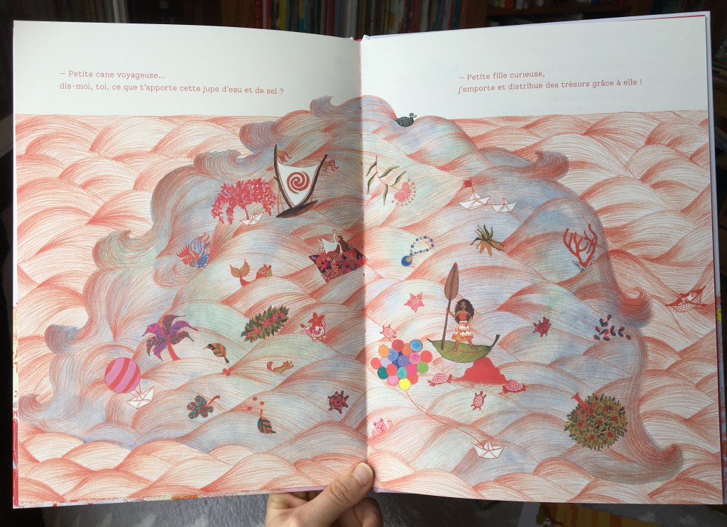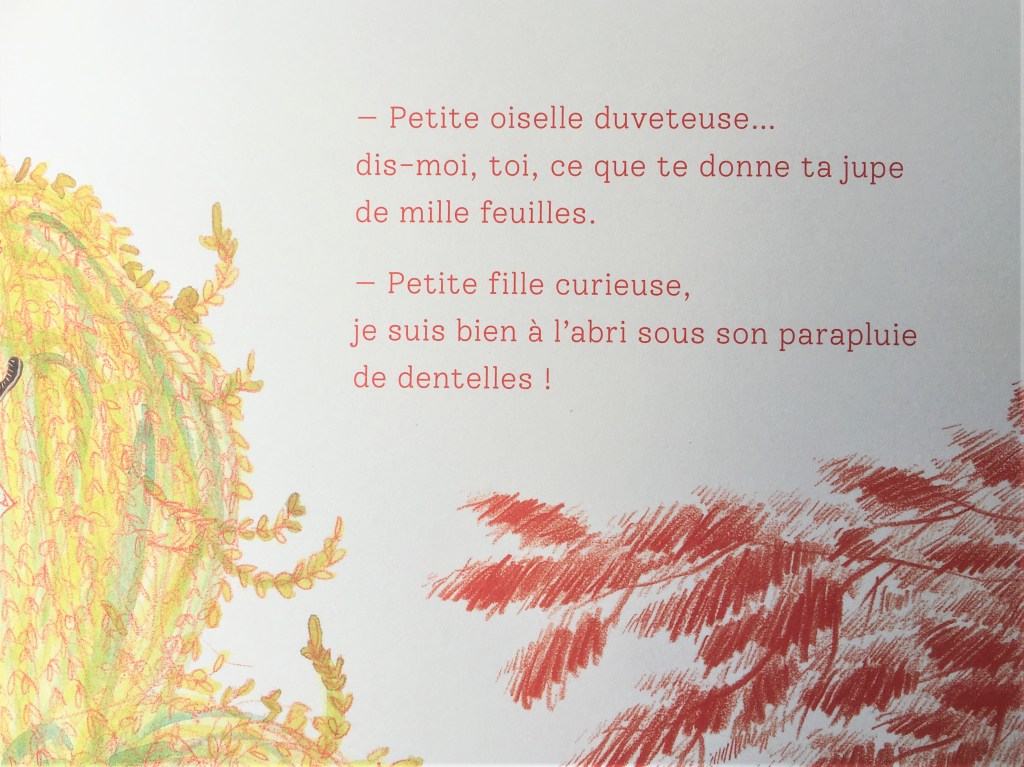 De la coccinelle à la fleur précieuse, de la demoiselle joyeuse à la cane voyageuse, de page en page les paysages permettent au lecteur émerveillé d’accrocher des étoiles dans les yeux. C’est chouette de voir que partout sur terre, il y a des histoires pour jalonner le chemin. Et comme par hasard, la plupart des personnages croisés sont…des héroïnes qui portent une jupe !