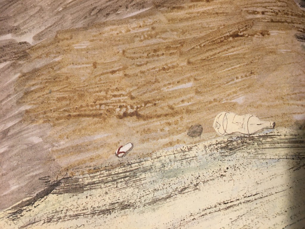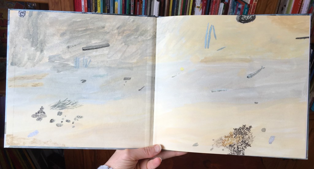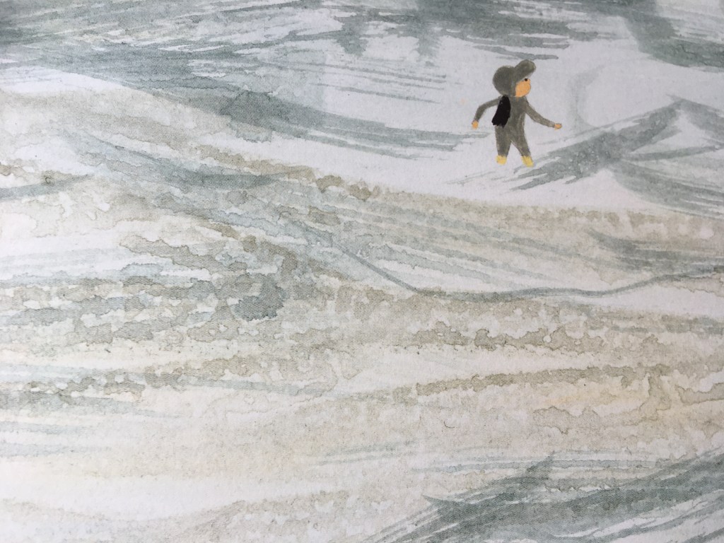 Merci Ylva Karlsson : cet album est une bouffée d’embruns. Sur la plage, on est pieds dans l’eau face au vent avec Caio. Des teintes pastels emplies de douceur nous transportent dans une ambiance automnale de bord de mer. La grandiosité de l’océan trouve son écho dans la détermination de l’enfant. La poésie visuelle d’Eva Lindström s’accompagne de quelques clins d’œil irrésistibles, comme ce poisson qui semble bouche bée en voyant la fillette couler, ou cette tong abandonnée.