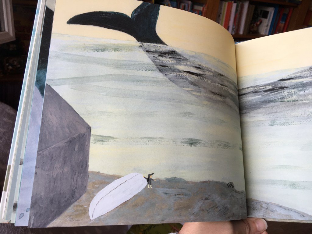 Ni une ni deux, l’enfant s’avance à la rencontre de l’animal et lui demande « Tu veux bien être mon amie ? ». Pas de réponse. Est-ce que la baleine a entendu la question ? Progressivement l’enfant s’avance sur la plage, puis progresse sur l’océan à coups de rame. Sans crier gare, la haute mer et ses vagues renversent le frêle équilibre de l’enfant.