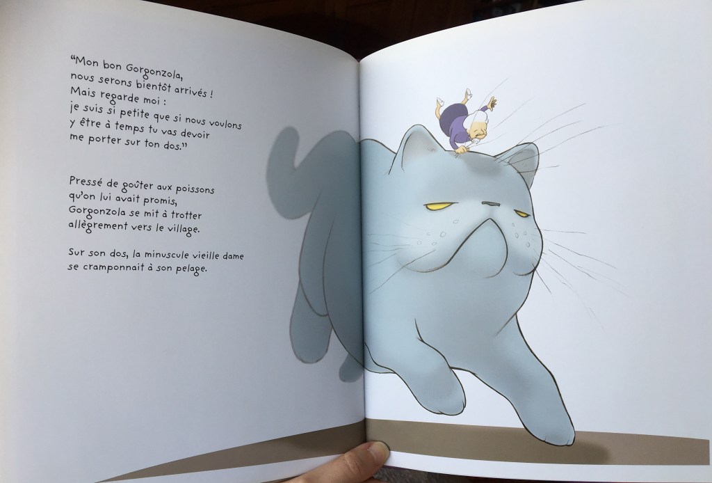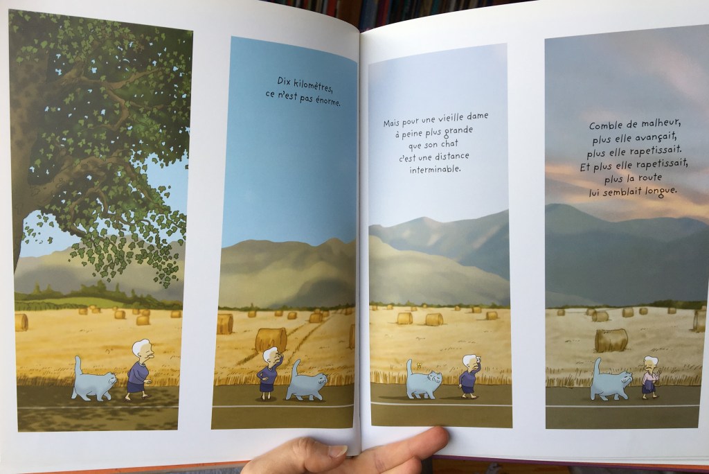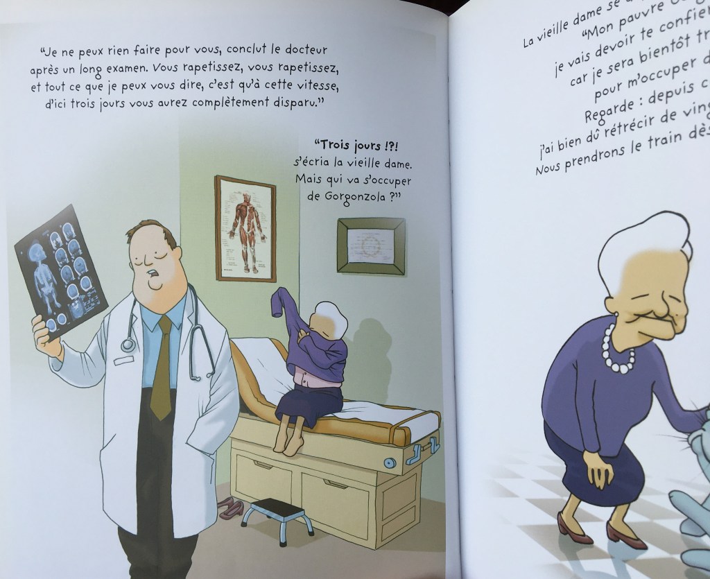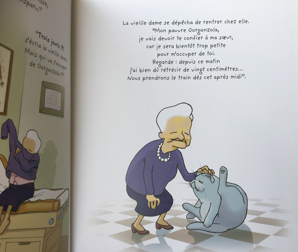 Il faut qu’elle le confie à sa sœur. Ni une ni deux, Madame attrape Gorgonzola : direction la gare. Le train l’emmènera-t-elle jusque chez sa sœur ? Que nenni, dans les trains les chats sont interdits. Un guichetier blasé la dirige vers un car, sans dire avec certitude s’il l’emmènera à destination. Il faut faire vite, les centimètres continuent de s’envoler. C’est une véritable course contre la montre. Enfin Gorgonzola et sa maîtresse se mettent en route mais le voyage s’arrête à dix kilomètres de l’endroit souhaité. Plus d’autre choix, il faut poursuivre à pied. Pauvre dame qui fait maintenant la taille de son chat : plus elle marche, plus elle rapetisse. Ils vont devoir passer la nuit blottis l’un contre l’autre.