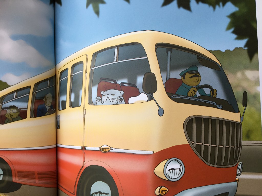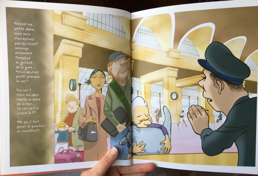 Moi qui suis une chat-addict, je ne pouvais que fondre pour une histoire où une dame fait tout pour que son chat soit bien après sa disparition. Aucune plainte, aucun larmoiement concernant sa situation à elle. L’important c’est que Gorgonzola soit bien. On comprend bien l’amour qui est placé dans l’animal de compagnie. La notion de responsabilité y apparaît de manière éclatante : le chat dépend entièrement de son maître. Comment imaginer l’abandonner à son sort ? Cette pensée intolérable motive le départ. Avec tendresse, les rôles s’inversent en cours de route et c’est Gorgonzola qui mènera la vieille dame à destination.