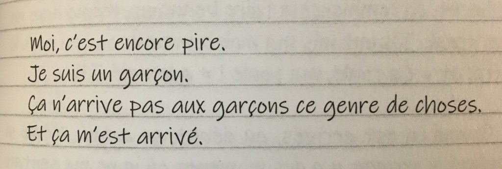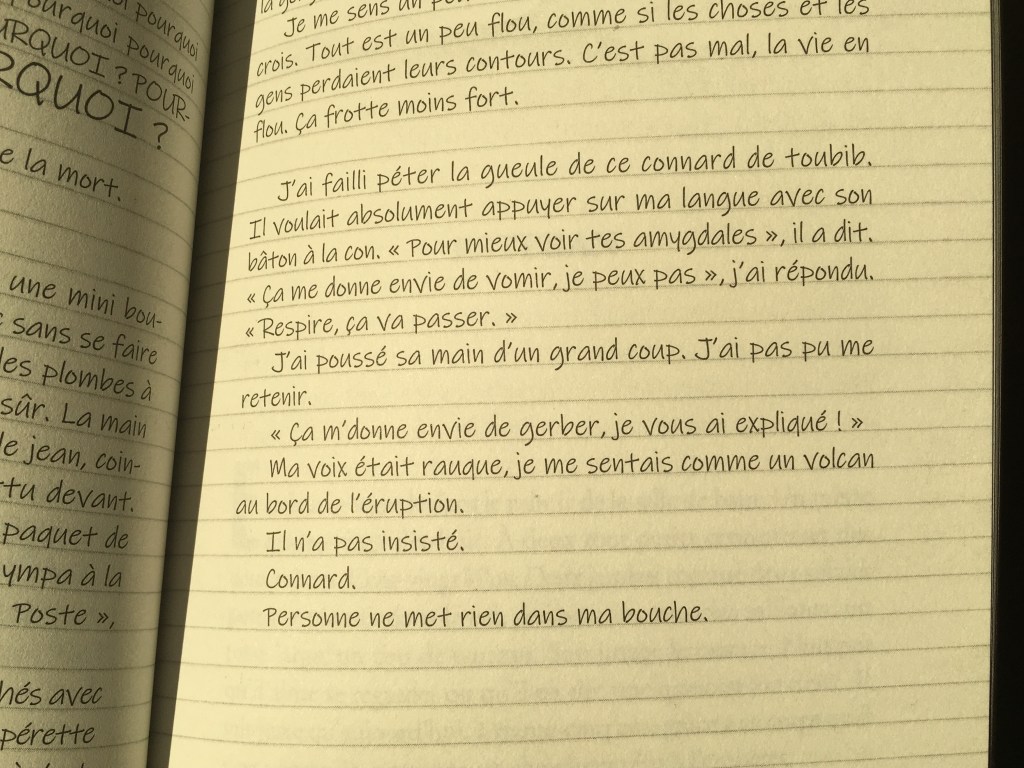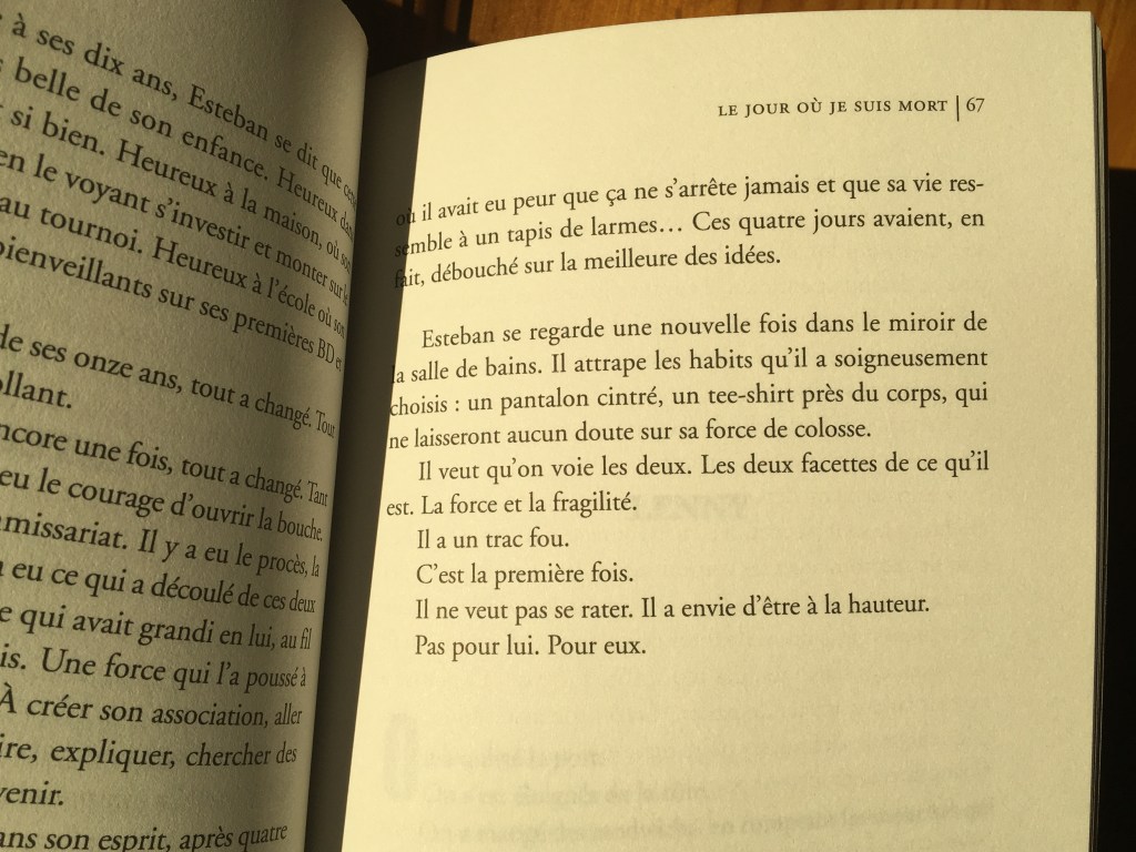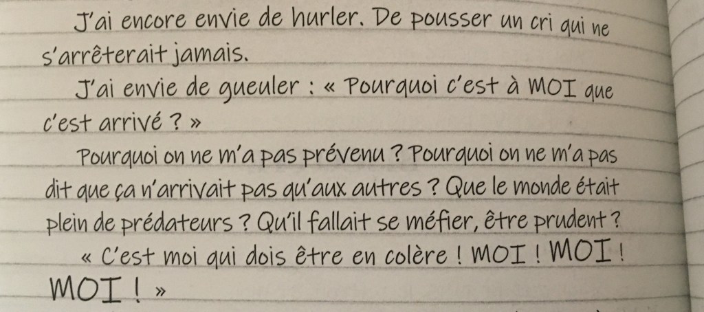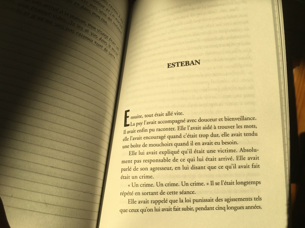 L’écriture exclue le pathos. Noir sur blanc, les mots imprimés déchirent mes yeux de lectrice quand bien même je savais que j’allais les lire. Le silence qui emprisonne les garçons est terrifiant. Le danger et la méfiance touchent désormais tous les aspects de la vie : l’intégrité du corps est brisée, les relations aux autres sont déréglées, les actions que l’on contrôle en permanence pour ne pas sombrer. Des années à vivre ainsi. Adolescence brisée. Épuisement, dégoût de soi, traumatisme, pensées suicidaires ou meurtrières, addictions : tels sont les quotidiens de Lenny, Saphir, Biscotte. Telle a été la vie d’Esteban, avant qu’il n’ose parler.
