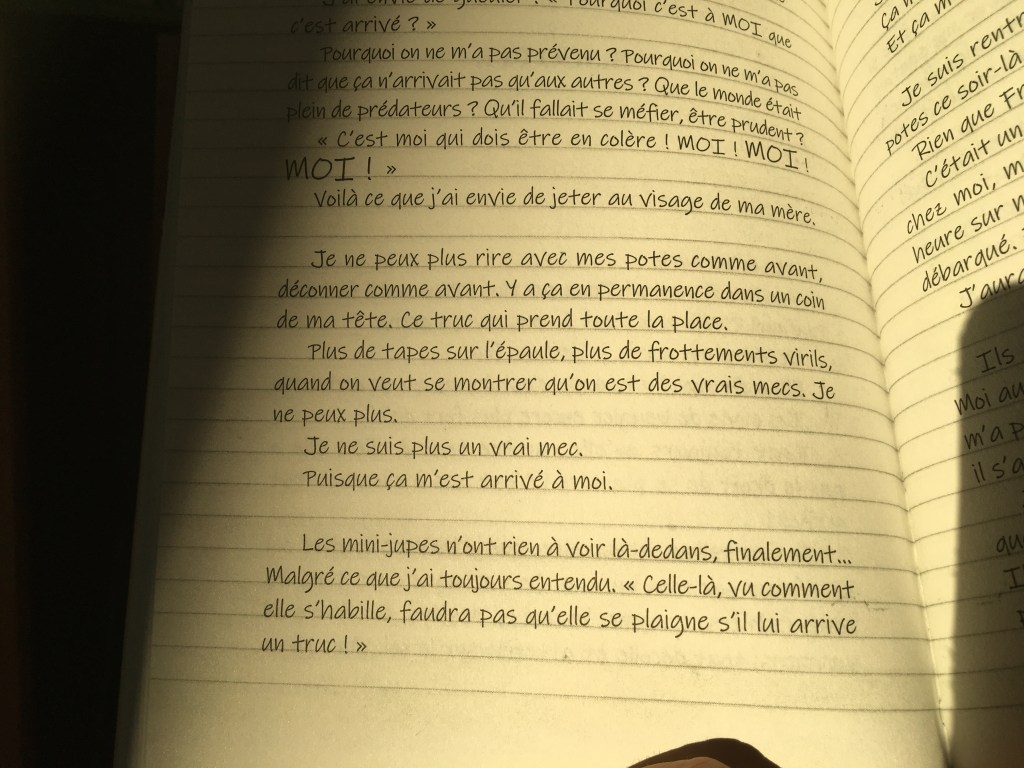 En filigrane, Sandrine Beau glisse quelques remarques pour élargir le débat : homophobie, la mini-jupe de la discorde. Parce que le viol est une abomination et que jupe ou pantalon ne sont pas des arguments pour justifier le passage à l’acte des violeurs. On médiatise davantage le viol qui touche les filles. Trop souvent on oubliait les garçons, jusqu’à ce roman.