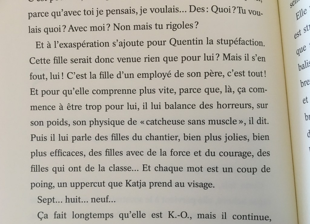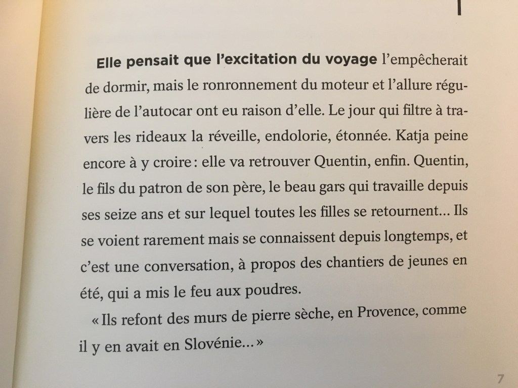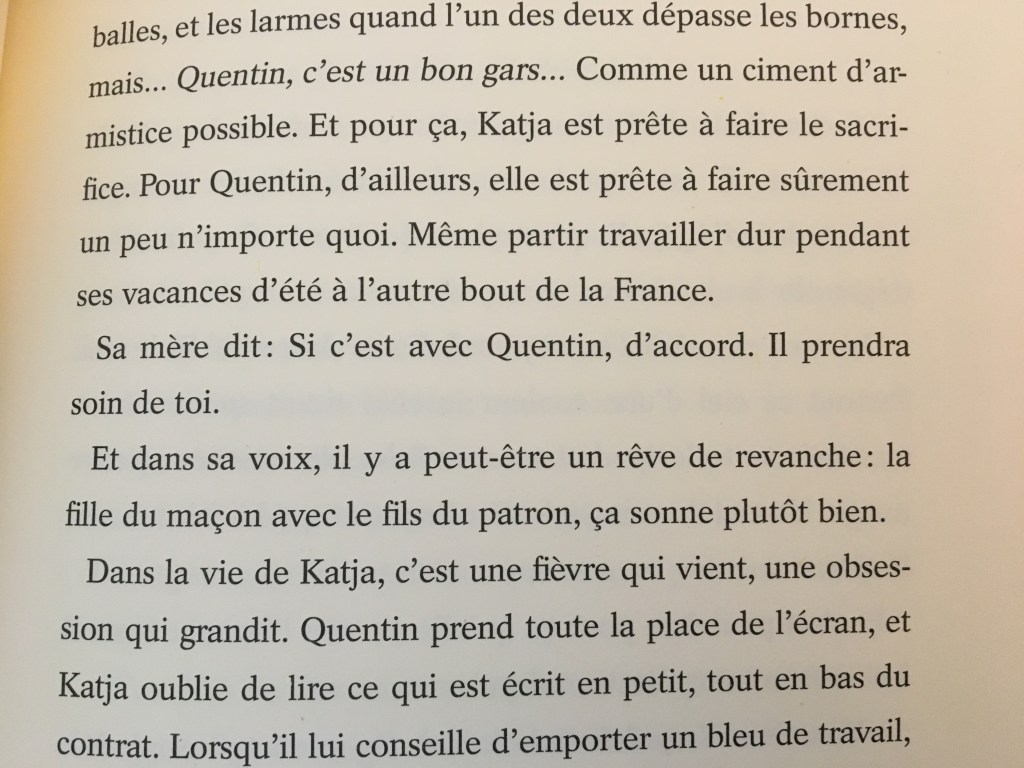 Récit au présent, on la suit dans les préparatifs de son départ sur un chantier d’été. Pour suivre Quentin, le beau Quentin, fils du patron de son père et objet de tous ses fantasmes, elle est prête à tout, même à passer trois semaines dans le sud de la France à apprendre comment reconstruire des murets en pierre sèche. Évidemment vous voyez venir le truc, et je vais l’écrire cash : Quentin s’en tamponne de Katja. Et le mec un tantinet imbu de lui-même, loin de la repousser subtilement, en profite pour la raplatir, la juger sur son physique, la mettre plus bas que terre…