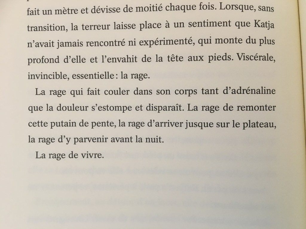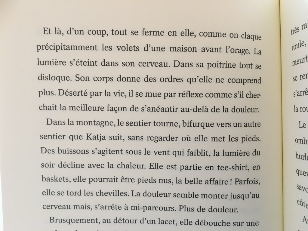 Le problème quand on se berce d’illusions, c’est que le réveil fait mal, très mal. Trop mal. Voilà Katja en mode cerveau limbique sur-activé. Elle court droit devant dans la montagne pour en finir, arrêter la douleur, sauter dans le vide, accélérer et…c’est raté ! Dans la caillasse de cette pente qu’elle pensait être un ravin, elle tombe et la douleur ressentie lui fait reprendre contact avec son corps. Sa conscience se remet en marche. La réalité la frappe : après le choc émotionnel, la souffrance de son corps. Puis les flots d’adrénaline qui se déversent pour « remonter la pente ». Au sens propre cela lui prendra quelques minutes d’acharnement, à ancrer ses pieds dans la terre, à agripper buissons et rochers.