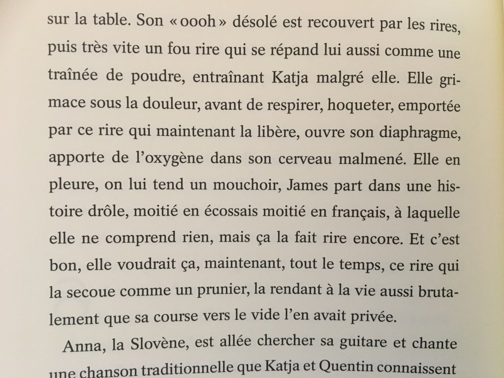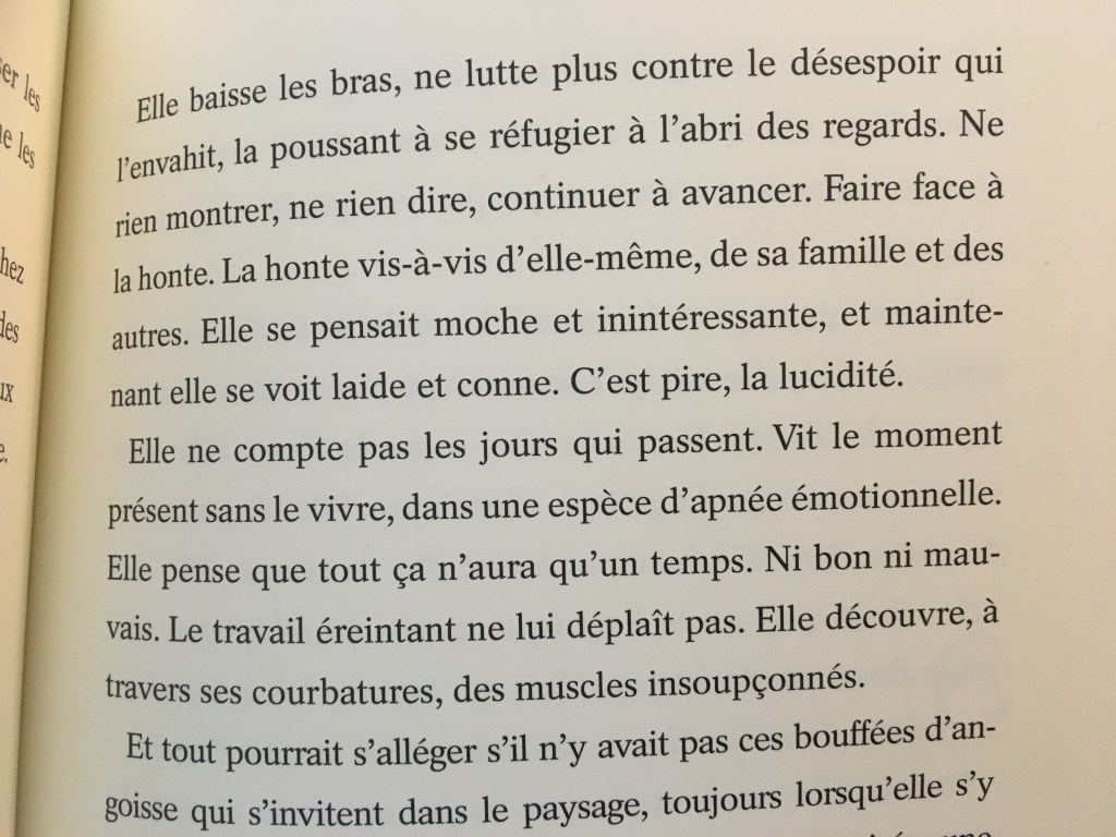 Les jours passent. Au sens figuré, Katja peine à « remonter la pente ». Pour anesthésier les pensées qui s’entrechoquent dans sa tête, elle s’abandonne au travail, aux seaux à porter, aux murets à reconstruire. Un traumatisme est là : le choc a posteriori de son geste fou et désespéré. Katja reconsidère sa vie avec un nouveau regard. Elle identifie ses illusions, se prend en pleine tronche la conscience de ce masque qu’elle a fabriqué pour se couler dans ce foutu moule sociétal. Dévalorisation, descente lente aux enfers du dénigrement. Il n’est pire ennemi que soi-même…Pourtant, tant qu’il y a de la vie, il y a de l’espoir. Progressivement Katja trouve une place dans cette équipe, elle se rencontre elle-même, se découvre capable, valable. On lui tend la main. Amiel trouve la faille et les mots qui permettront aux larmes de purger ce chagrin, ce sable mouvant dans lequel elle s’enfonçait lentement. Katja découvre qu’elle n’est pas seule, que des amitiés sont nées, simplement, sûrement, sans faux semblants.