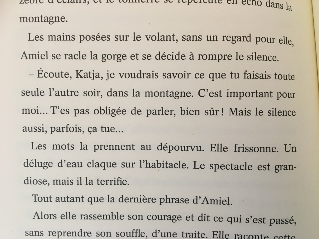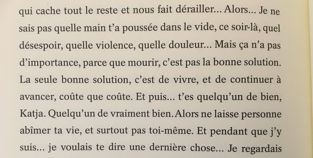 A courir après un mirage, on risque de ne trouver que du sable. Voilà la douloureuse expérience de cette adolescente en quête d’elle-même. Le hic c’est de chercher dans le regard des autres cette valeur qu’on n’ose pas se donner. Quentin catalysait bien des espoirs. Il était cette échappée du réel à laquelle Katja s’accrochait pour ne pas regarder de manière trop frontale sa vie dissociée depuis le divorce parental et les conflits livrés avec. Il était beau ce film qu’elle avait fabriqué sans douter de lui. La chute est à la mesure de la hauteur des illusions. Le désespoir progresse comme une bombe atomique, détruisant tout. Quand la machine émotionnelle s’emballe, il n’est plus question de raisonner. Dissociation, fuite et mauvaise décision. Ils sont légion les ados qui se suicident pour cause de chagrin d’amour ou mal de vivre. Le paysage est obscurci au point de ne plus laisser entrevoir la moindre étincelle de lumière.