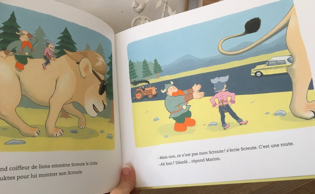 Sous la forme d’un conte randonnée, l’histoire nous conduit dans la forêt des Krouktes où Screute le Gröte cherche son Scroute. Car Scroute est parti : il a quitté le jardin et cela n’était JAMAIS arrivé. Alors Screute le Gröte a de quoi être inquiet. Ce grand gaillard de viking aux augustes moustaches rousses et aux biscottos saillants se met en route et sur celle-ci, il croise d’abord Marion le grand coiffeur de lions. Ce dernier affirme avoir vu le Scroute de Screute. Sur le dos de ce bellâtre de lion qui le vaut bien, les voilà partis chercher le Scroute mais pas de chance, Marion conduit Screute près d’une route…Oups…Raté !