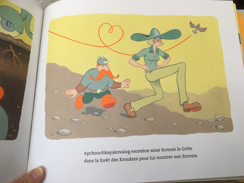 Côté illustrations, j’adore le côté international dans lequel nous promène Pizar. Elle est sacrément grande cette forêt des Krouktes : gare aux cactus juste avant d’arriver à la grotte de Lescroute (toute ressemblance avec une grotte existante serait fortuite je suppose…) ! Côté couleurs ça claque, c’est gai, c’est sonnant, détonnant et ça accompagne superbement le caractère farfelu des interlocuteurs de Screute.