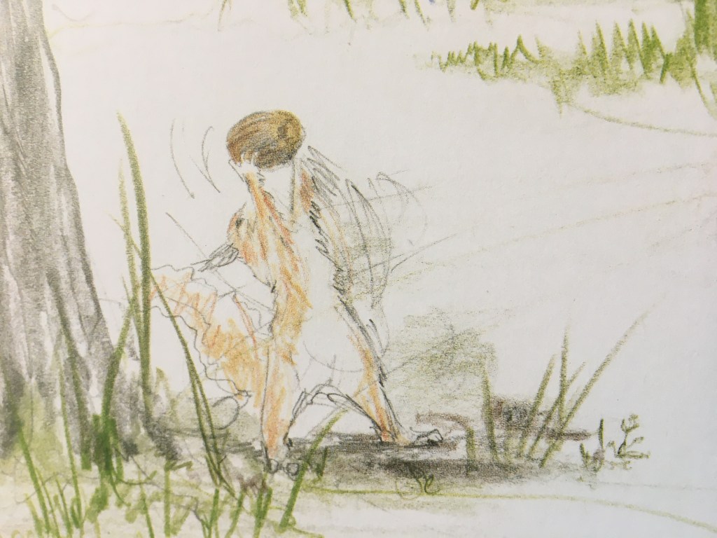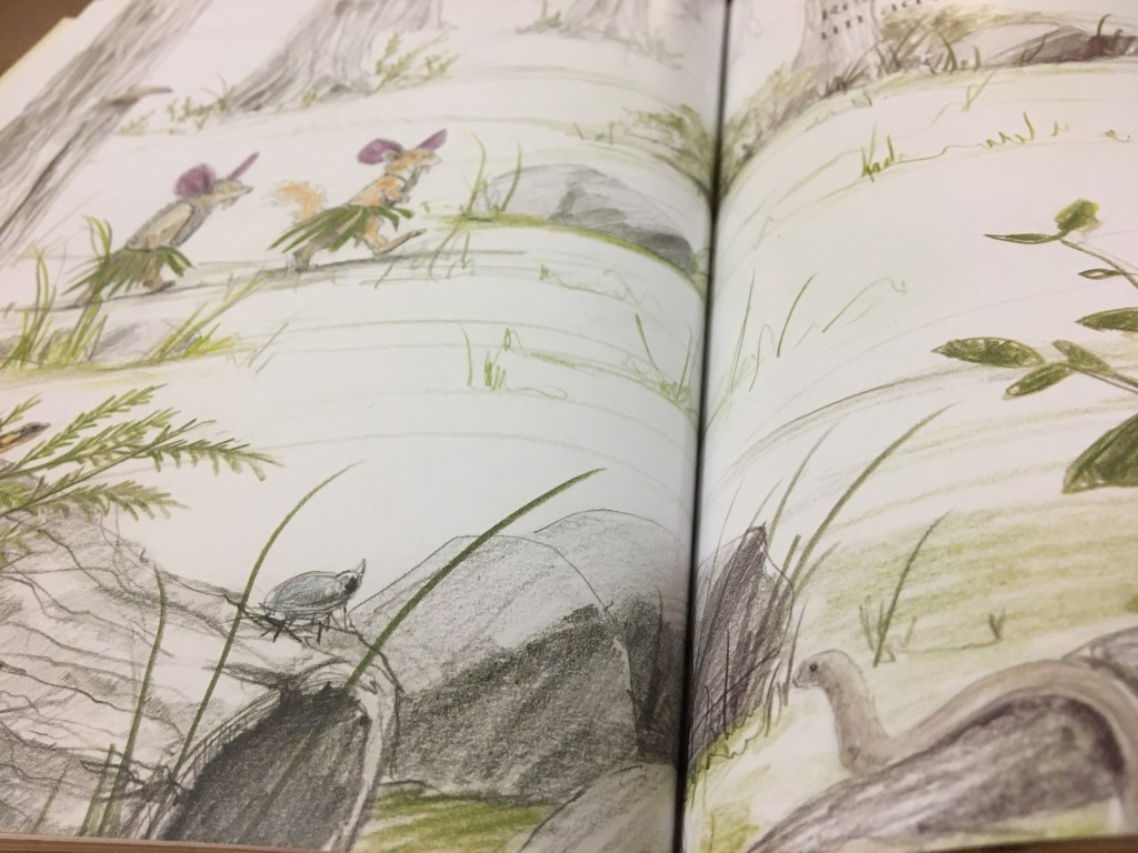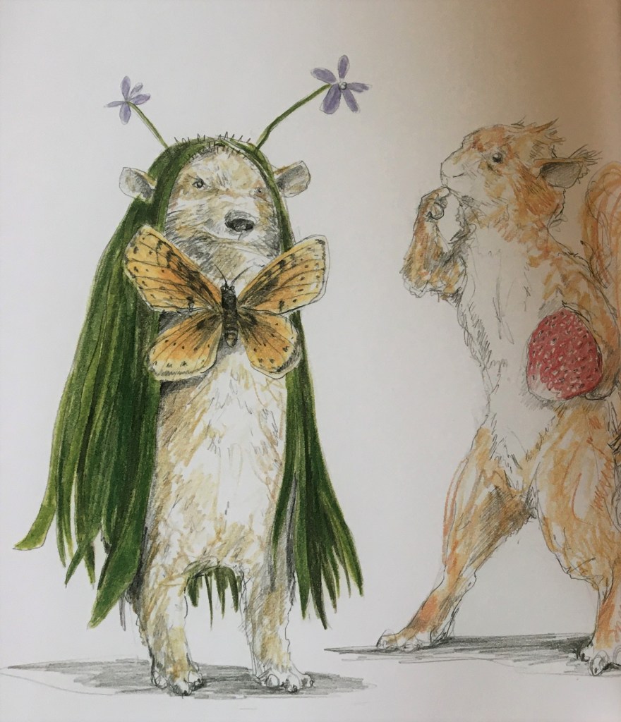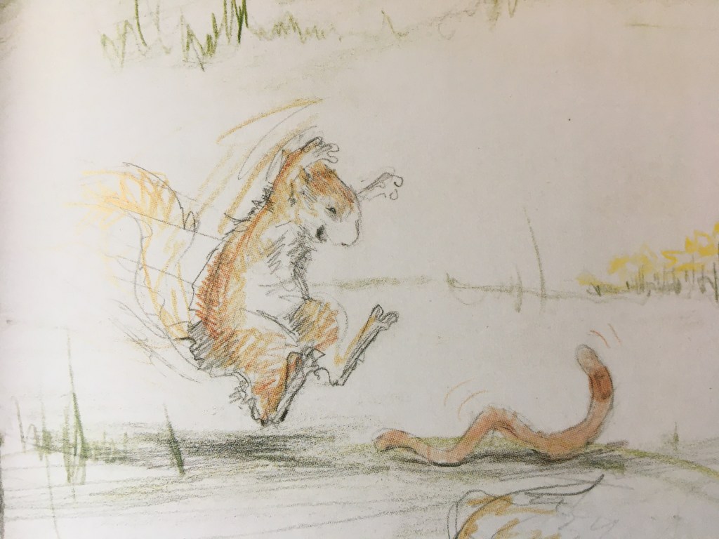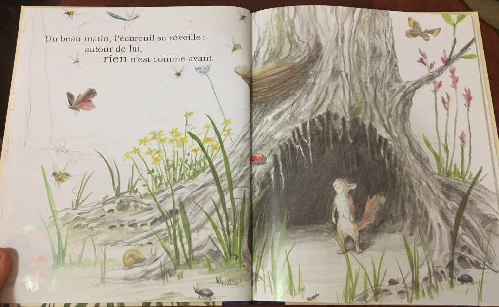 L’histoire commence dès la page de garde. Le printemps s’éveille et dans les formes crayonnées de Sebastian Meschenmoser, on aperçoit les oiseaux, les papillons, les souris des champs qui sortent le bout de leur nez, attirés par la douceur ambiante et la nécessité de se sustenter (ils ont faim quoi !). L’écureuil s’éveille aussi. Surpris, interloqué, il se demande « pourquoi » tout n’est plus comme avant : toutes ses couleurs, d’où sortent-elles ?