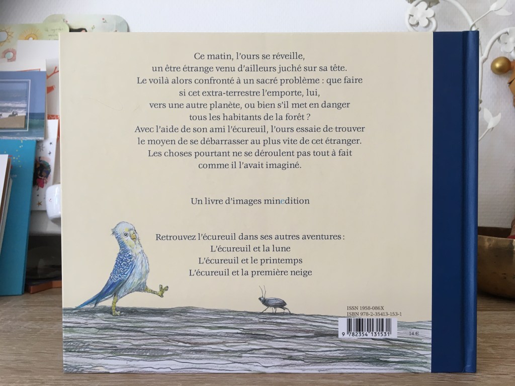 Ours est bien embêté : une étrange créature bleue le suit. Il a bien essayé de la semer mais toutes ses tentatives ont échoué. Paniqué, il vient quérir les bons conseils de son ami l’écureuil. Ce dernier ne voit qu’une explication : la créature doit être un extraterrestre qui veut enlever l’ours. Vite, avec l’aide du hérisson, opération leurre et camouflage…Raté, la créature bleue n’est pas facile à berner. Quelle sera leur tactique suivante ?