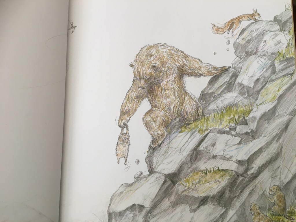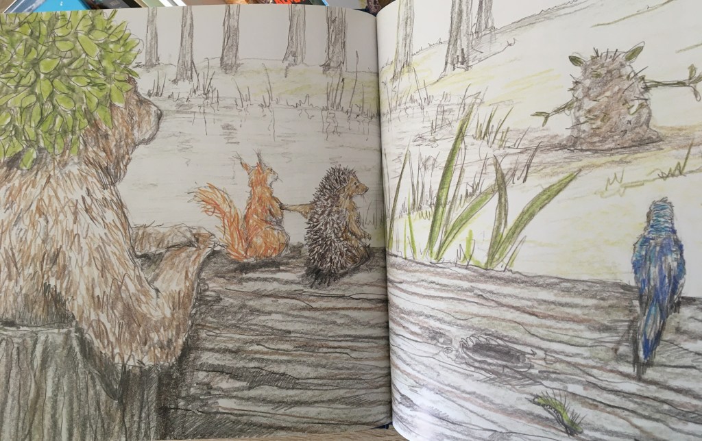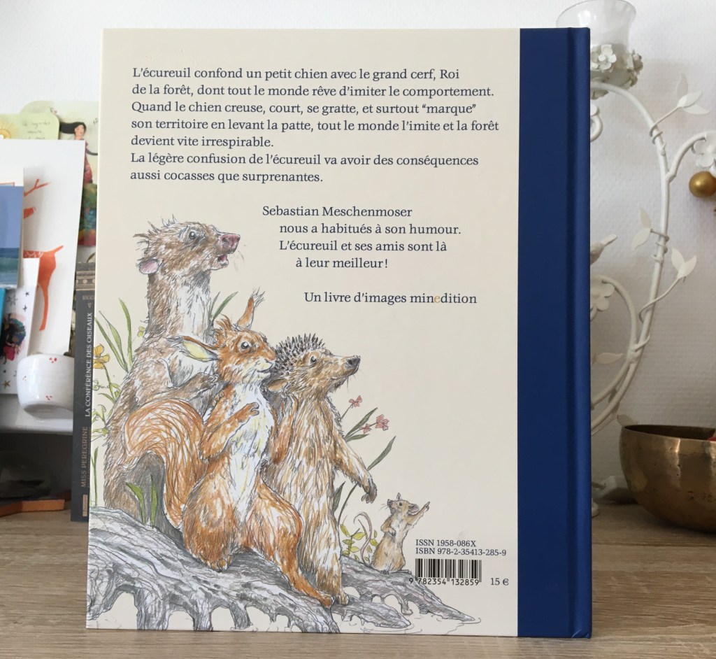 Dans la continuité de L’écureuil et la lune ( https://clarasurlalune.com/2021/03/23/lecureuil-et-la-lune/ ) et L’écureuil et le printemps ( https://clarasurlalune.com/2021/03/22/lecureuil-et-le-printemps/ ), dans ces trois opus les quiproquos se nourrissent de la tendre naïveté des habitants de la forêt. Tout est annoncé avec les illustrations crayonnées qui habillent les pages de garde…et il faut regarder les albums jusqu’au bout ! Entre les deux, ce n’est que fraîcheur de la forêt, poésie et détails hilarants (c’est très difficile de résister au rire qui vous cueille par surprise).