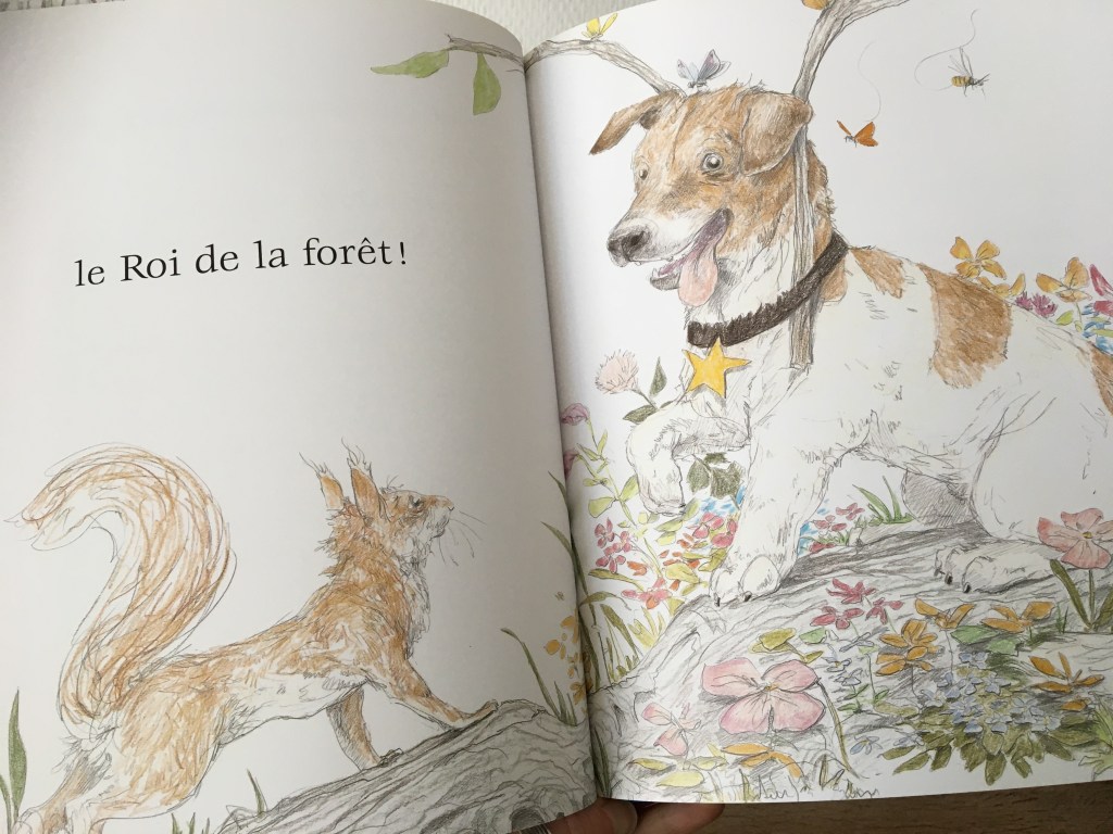 Le bouc a raconté à ses amis à quoi ressemble le roi de la forêt. Un petit chien vient à passer. Avec l’étoile accrochée à son collier et les branches qui dépassent de son cou, l’écureuil est certain qu’il vient de rencontrer le roi de la forêt. Une supposition erronée doublée d’une énergie de folie, voilà l’écureuil et bientôt tous les animaux de la forêt qui imitent les attitudes du petit chien. Petit problème deviendra grand : le marquage de territoire sur commande présente quelques difficultés…