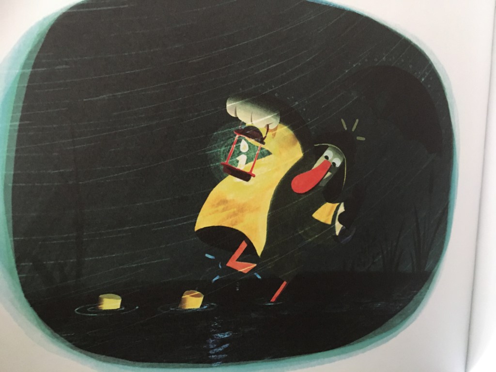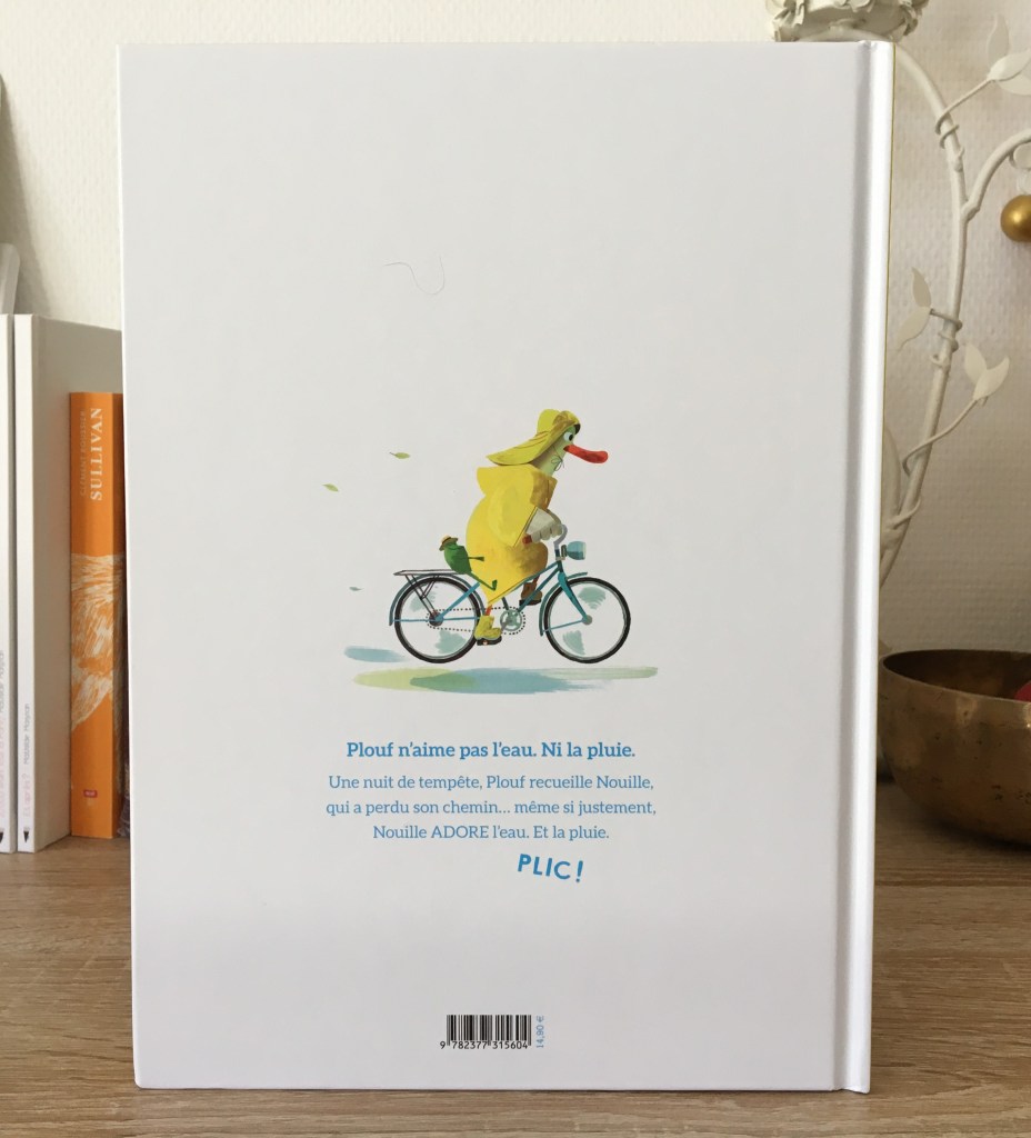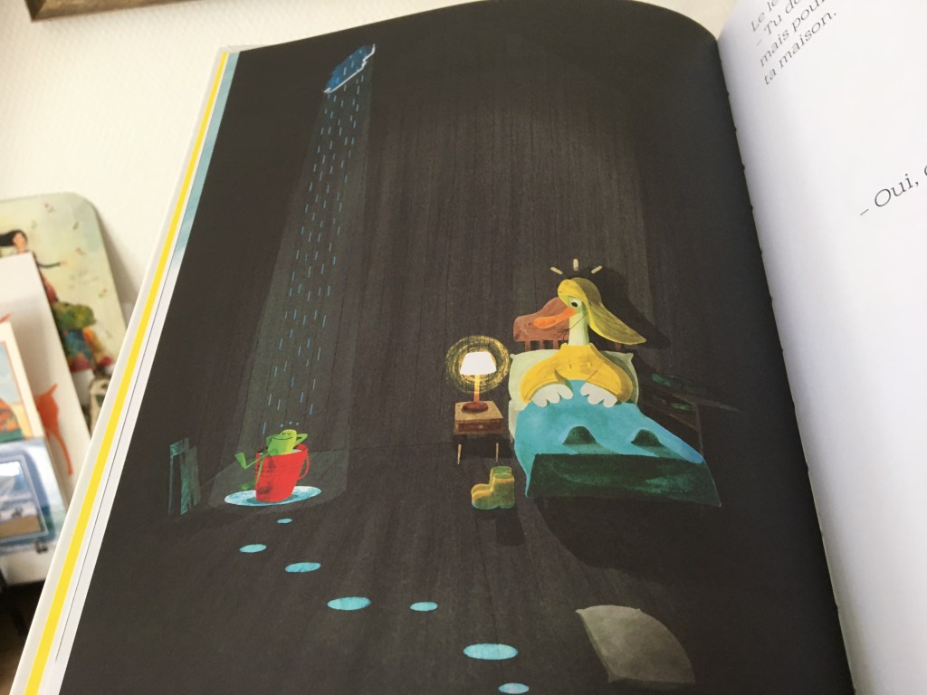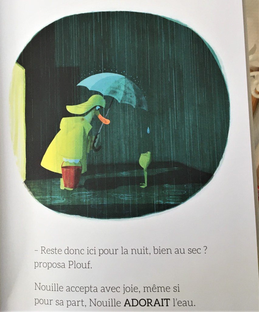 Avec ses couleurs toutes acidulées, ses contrastes ombres et lumière, Plouf et Nouille héberge une jolie expérience de vie. Parfois les croyances limitantes s’éloignent d’elles-mêmes. Ce qui rassemble ne se niche pas nécessairement dans la ressemblance. La preuve en est qu’on peut même singulièrement s’attacher à celui qui nous ressemble si peu. Voilà pourquoi Nouille prend son ciré, son chapeau, ses bottes et brave l’averse pour retrouver coûte que coûte son ami.