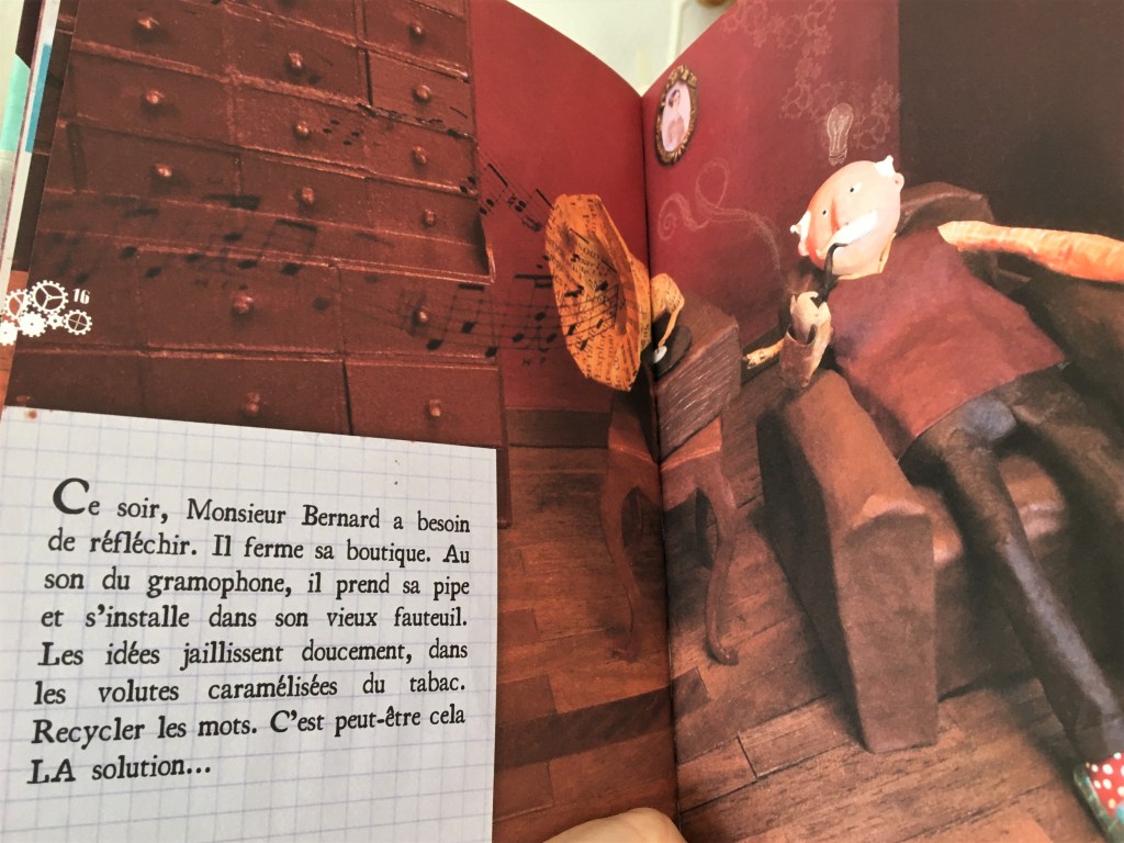 Pour ceux qui en auraient besoin, Monsieur Bernard a aussi les noms d’oiseaux, des gros mots, des mots fleuris. Il dispose également de syllabes simples, de mots tendres : le choix est vaste mais les stocks baissent rapidement. Le commerçant s’inquiète : que se passera-t-il s’il ne lui reste plus que des mots déprimants dans ses tiroirs ? Comment faire…se pourrait-il qu’on puisse transformer des mots, les remodeler, les recycler ?