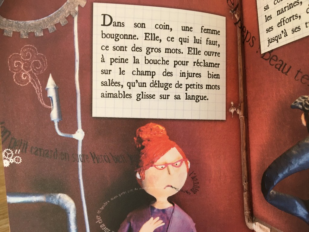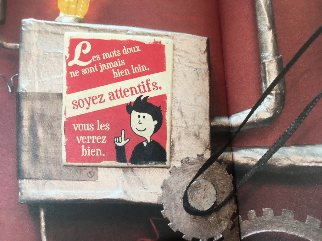 A l’instar des illustrations charmantes d’Elisa Granowska, faites de bric, de broc, de trucs découpés, assemblés, bidouillés en 3D, Monsieur Bernard bricole, assemble. Une fois son ouvrage achevé, il déverse les mots désagréables dans sa machine et…il attend. Le lendemain, la surprise est digne de ce nom pour ses clients. Qu’ils le veuillent ou non, les gens repartent avec des mots affables, courtois, délicats. Mieux encore, les mots doux s’envolent, se répandent, s’infiltrent par les portières, par les fenêtres. Personne ne leur échappe et c’est tant mieux. Mission accomplie pour Monsieur Bernard !
