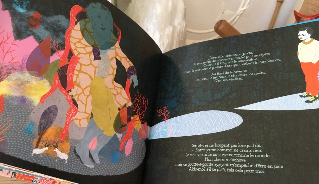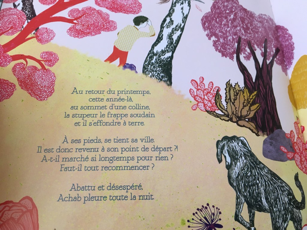 Un pas après l’autre, il marchera longtemps avant de retrouver…un bruit. Comme c’est étrange d’entendre à nouveau : c’est comme un sourd qui récupèrerait l’audition, comme un phare dans la nuit. Achab se laisse guider jusqu’à ce vieillard dans sa grotte. Ce dernier a un gros problème qui le tourmente et qu’il ne peut résoudre. Achab répond à sa demande d’aide : il dégage la pierre qui bouchait la source, et il reprend son chemin, sa quête…
