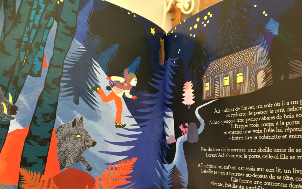 L’hiver est arrivé. Le chemin mène Achab à une maisonnette dans les bois. Quelle aubaine : c’est qu’il fait froid ! Une voix l’invite à tirer la bobinette et à entrer. L’amitié se crée à la lueur du feu et des contes.