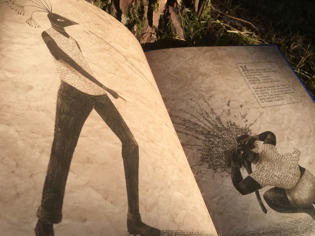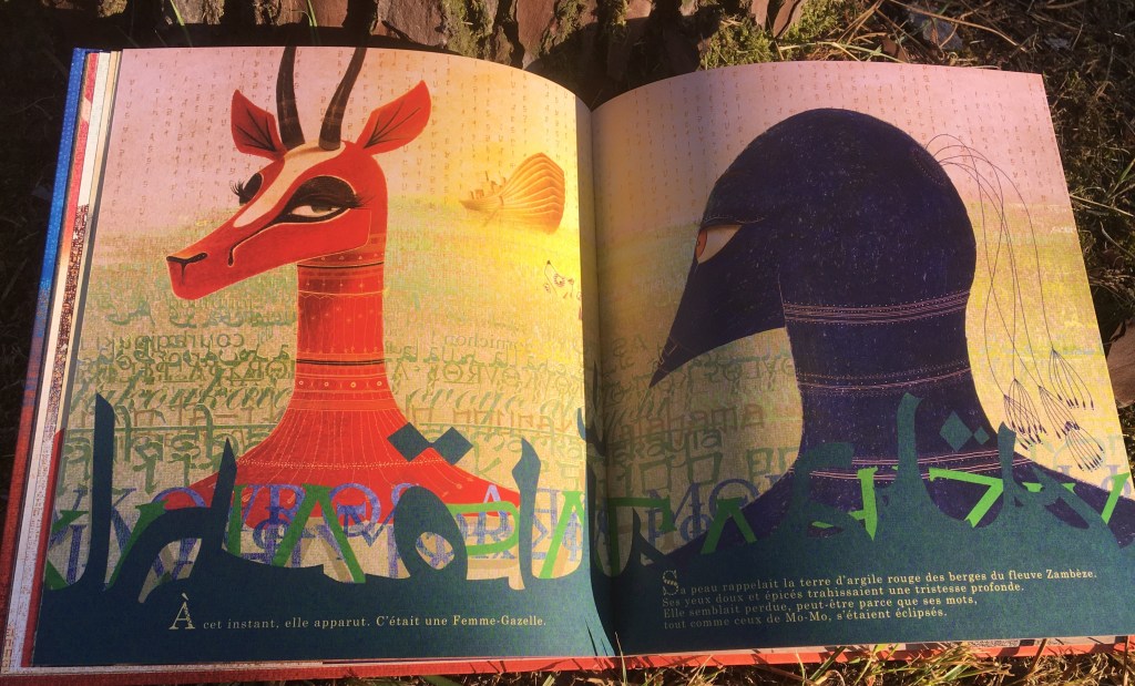 Donc, puisqu’il ne peut compter que sur lui-même, Mo-Mo part en quête de ses mots. Comment, lui le poète, comment pourrait-il vivre sans eux ? Il se rend au pays des mots : devant lui se déroulent des chemins pavés d’alphabets du monde entier. Ce n’est qu’un bref aperçu de ce qui l’attend à destination. Au terme d’un long voyage, il arrive dans un pays qui me semble familier. C’est qu’il ressemble étrangement à celui exploré par Jeanne et Thomas dans La Grammaire est une chanson douce (merci Erik Orsenna). Dans ce Mot-Zambique là, il y a partout des mots et les gens qui vont avec. Ces derniers ne tardent pas à remarquer que Mo-Mo n’est pas comme les autres. Sans ses mots, Mo-Mo dérange, dénote : comment ose-t-il s’exhiber « dé-mot-er » ?