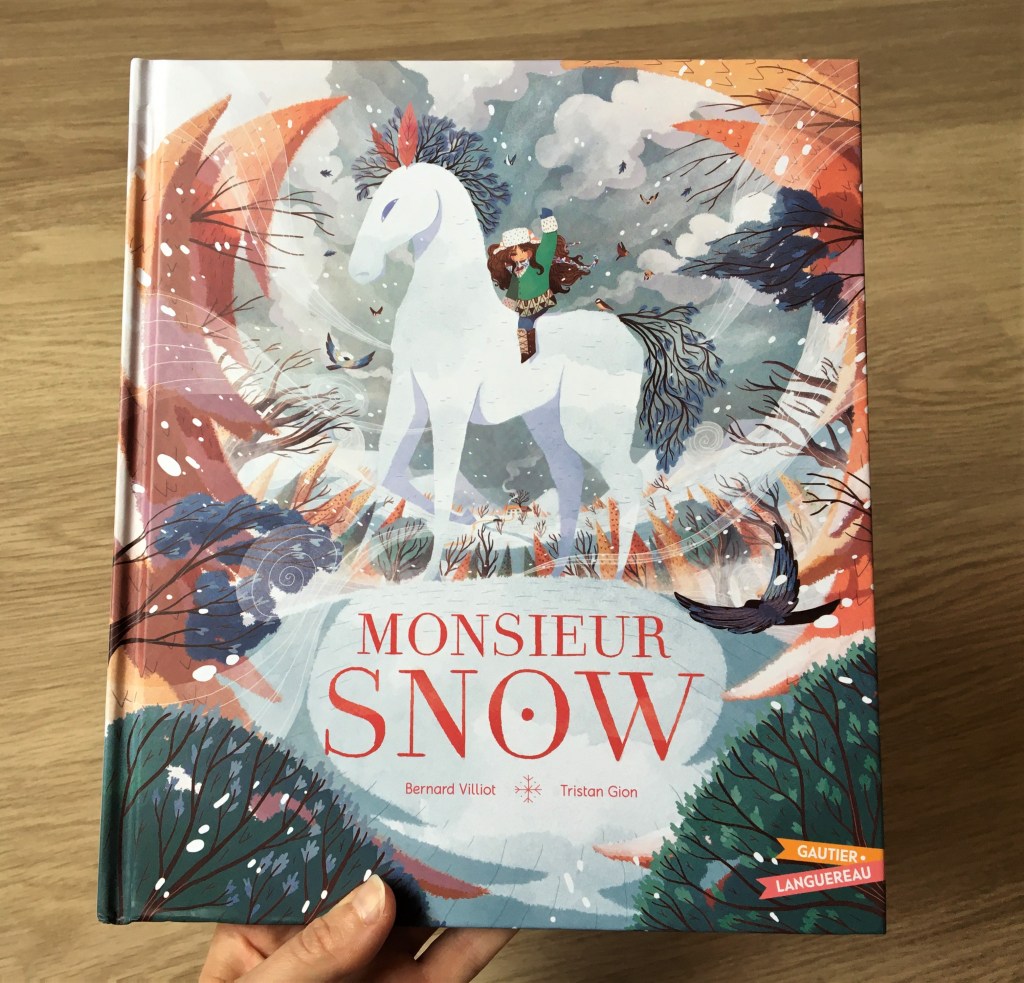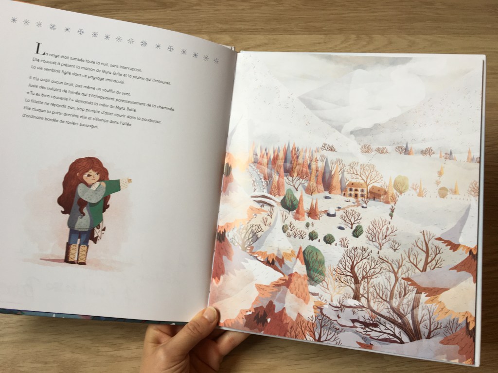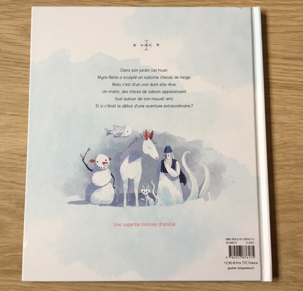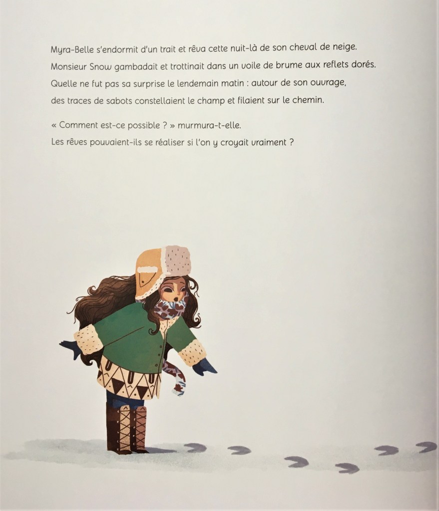 L’album s’ouvre sur une clairière paisible. Dans le cocon de silence qui suit le lever du jour, les rayons du soleil illuminent le paysage hivernal et ses promesses. Dans la maison, Myra-Belle trépigne de rejoindre l’extérieur. Elle a un grand projet auquel consacrer sa journée. Sous le ciel pastel, Myra-Belle rassemble, sculpte, retouche, peaufine. Sous ses doigts, peu à peu, Monsieur Snow, le cheval de neige apparaît !