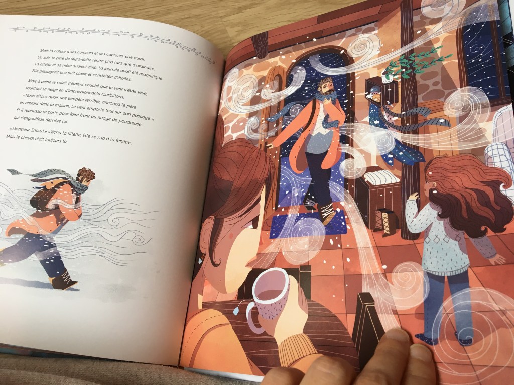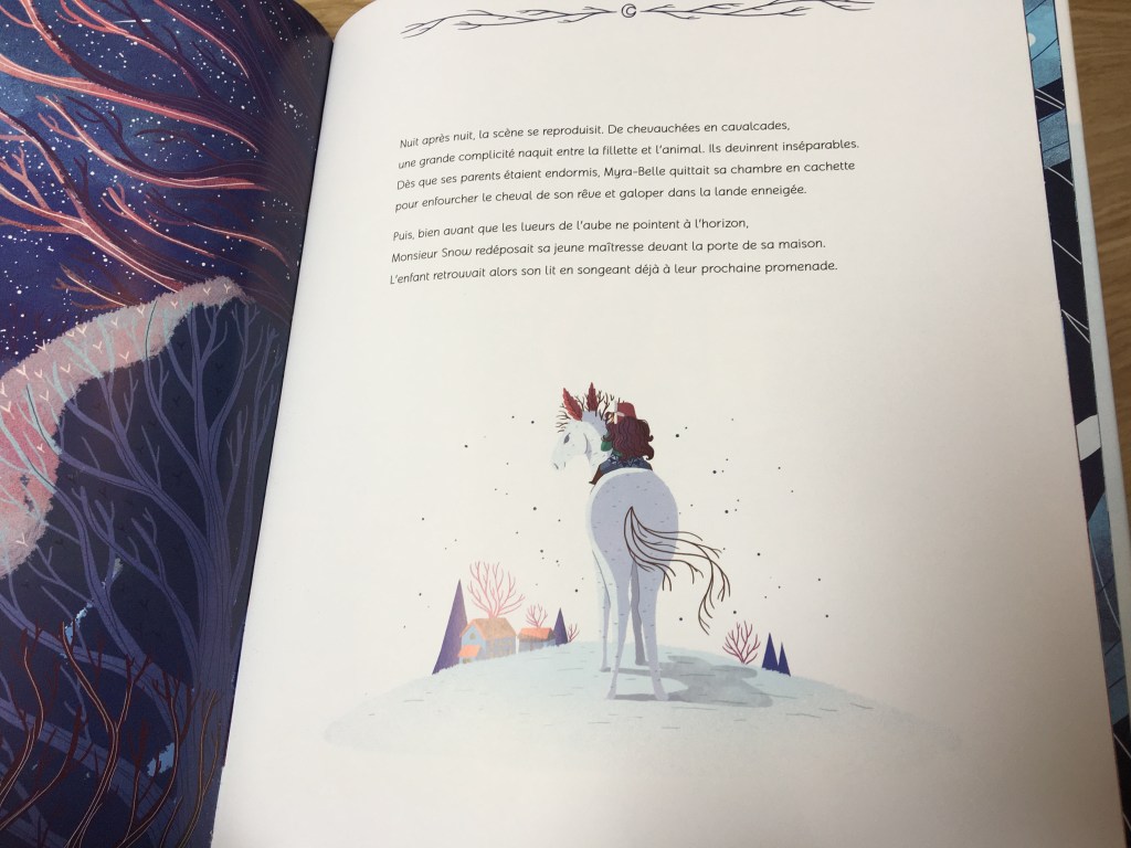 La fillette rêve d’un vrai cheval. Chaque jour elle espère une réponse positive de ses parents quand elle leur parle de l’animal tant souhaité. Pour l’heure il faut songer à se reposer. La nuit ouvre la porte des possibles et au pays du sommeil, Myra-Belle rêve que Monsieur Snow s’éveille.