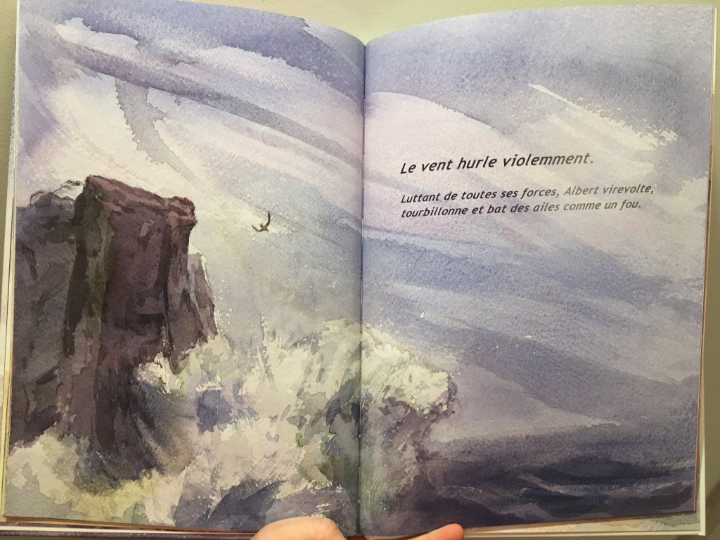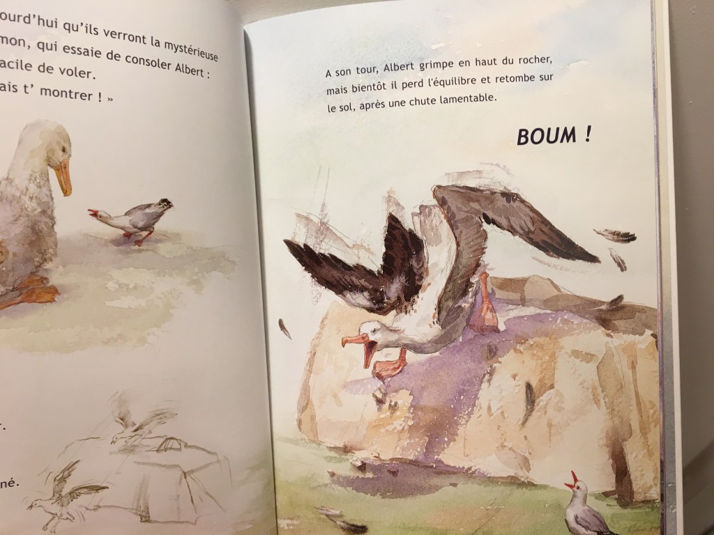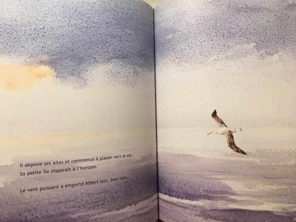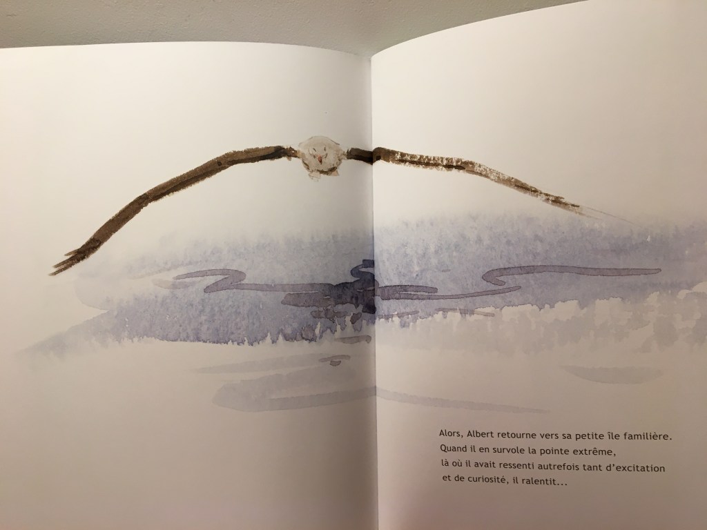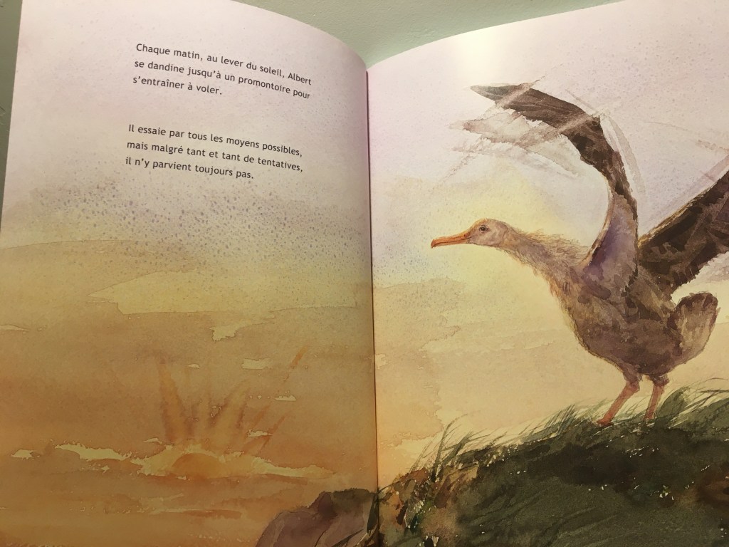 Ce qui me touche particulièrement dans cet album, c’est l’amitié façon envers et contre tout. La petite mouette prend sous son aile le roi des oiseaux. Il l’encourage, il reste présent. Il a vu lui, le potentiel de son ami. Il ne doute pas. Il sait de quoi Albert sera capable avec ses ailes majestueuses.