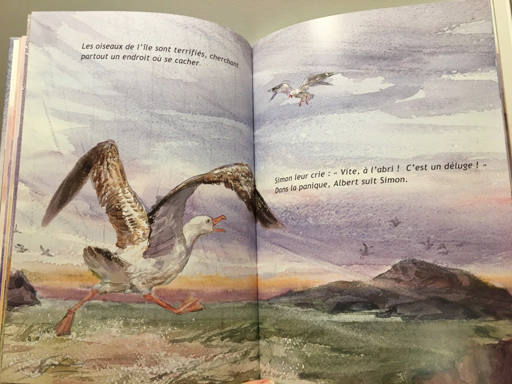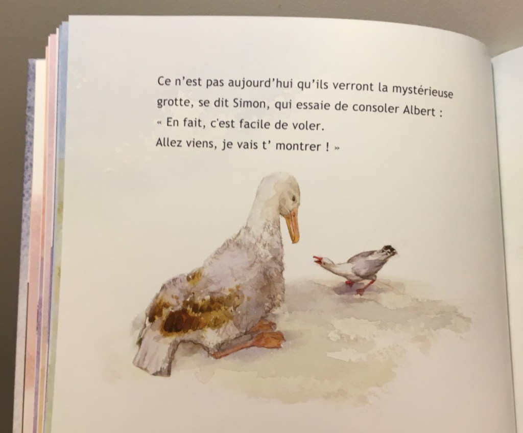 Heureusement il y a Simon, son ami mouette qui lui dépose de quoi manger, à lui la risée de l’île. Parce qu’un oiseau qui ne vole pas, qui tangue et qui va cahin-caha sur ses pieds palmés, c’est la honte quoi !