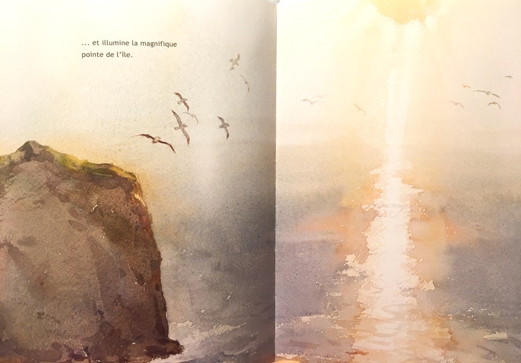 Les illustrations de Chin-Lun Huong sont stupéfiantes : je les trouve sublimement sensorielles. La rudesse du sol sur lequel Albert s’écroule trouve son pendant dans l’espace sans limite du ciel qui se déroule au-delà de l’île. La masse rocheuse compose avec les assauts des vagues et du vent et quand souffle la tempête, les doubles-pages paysages suscitent immersion, souffle retenu et fascination. Voir le monde avec les yeux d’Albert, c’est admettre que c’est tellement plus beau vu de haut.
