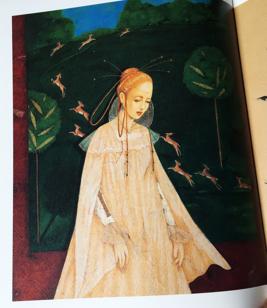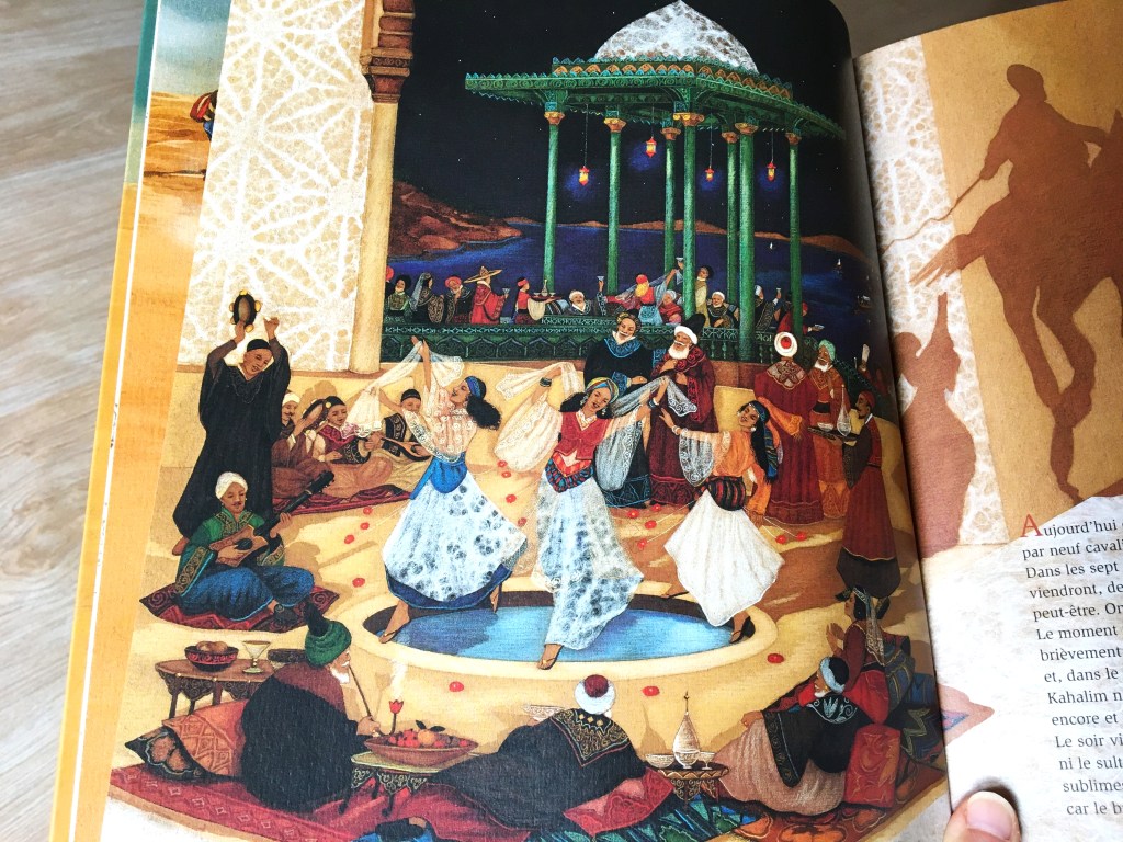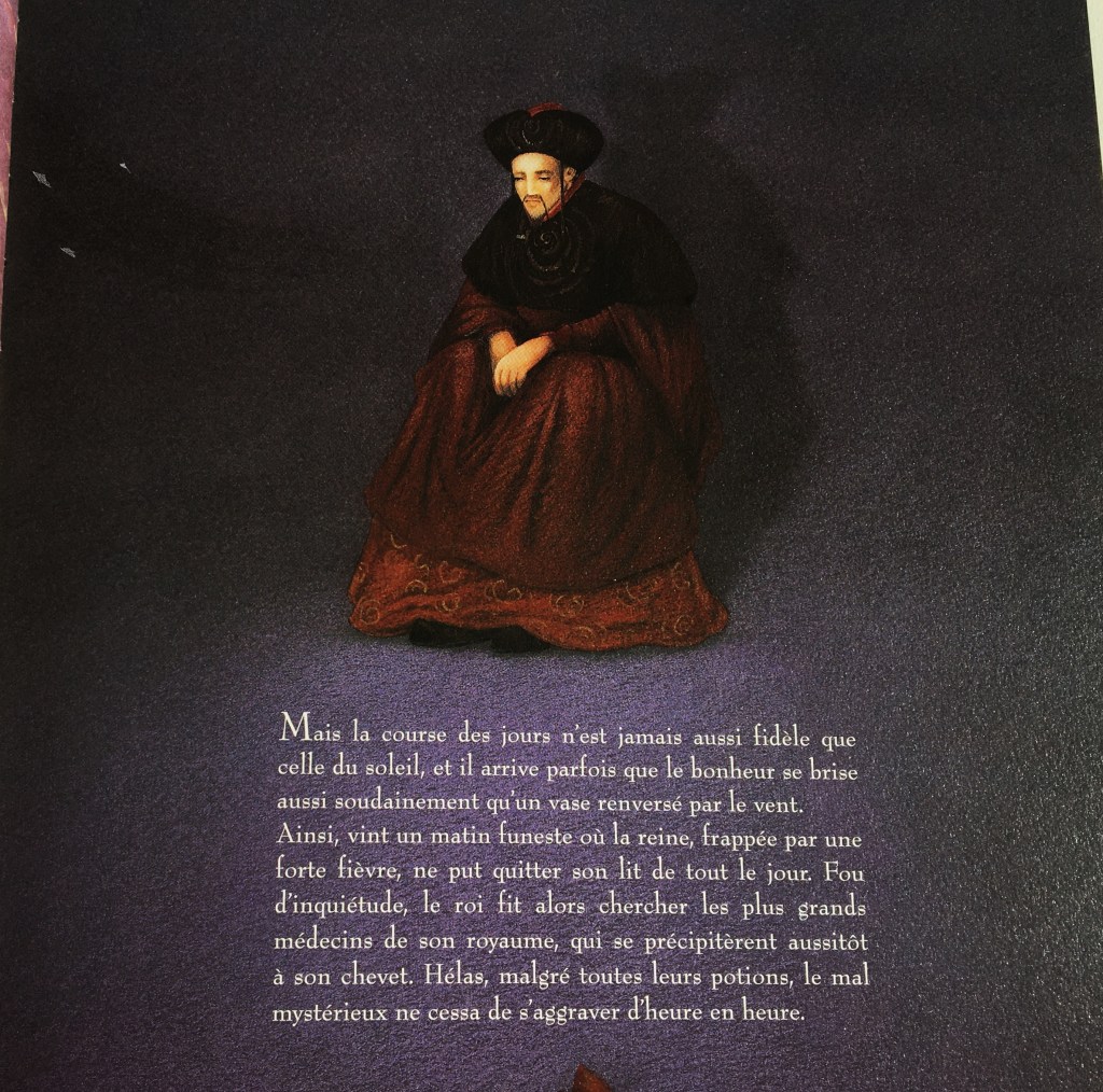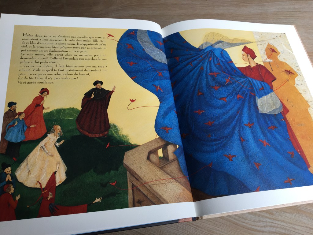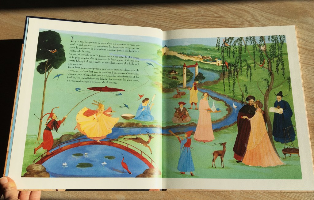 Certaines doubles-pages font vagabonder mon esprit vers les Très riches heures du Duc de Berry. D’autres, de par leurs perspectives adaptées, oriente mon vagabondage visuel vers la Perse ou bien quelques estampes me suggèrent une ambiance japonaise. Un dépaysement à la hauteur de la magie des contes n’est-ce pas ?