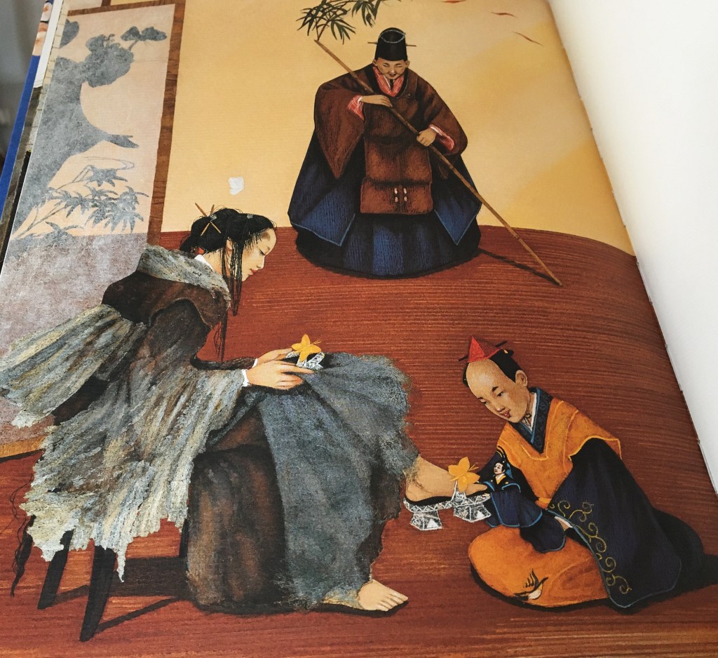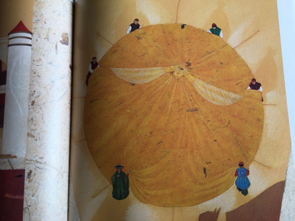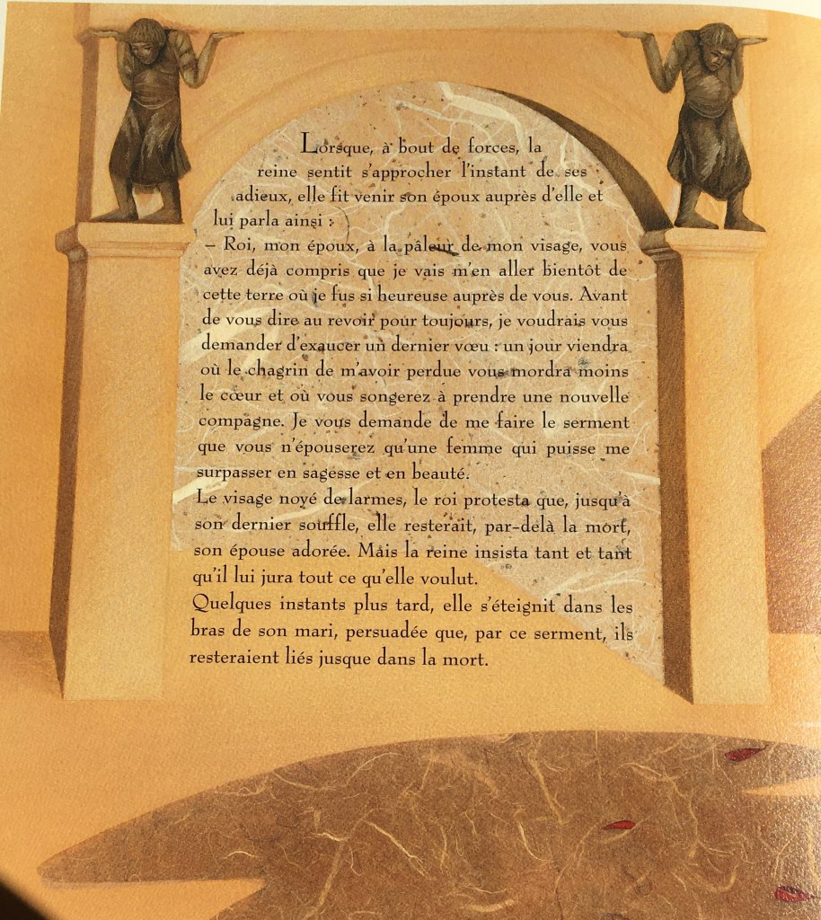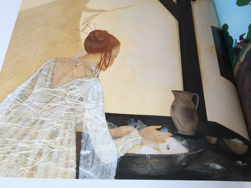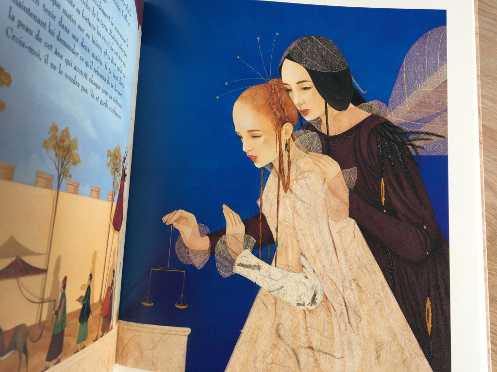 Les illustrations sont à la mesure du conte : merveilleuses même dans les moments les plus sombres. Le regard se pose ici et là, pour revenir contempler le raffinement des inspirations orientales que l’illustratrice nous offre. Tant de grâce dans le mouvement des étoffes précieuses, que de délicatesse des ailes de la fée Lilas faites de pétales et fines feuilles.