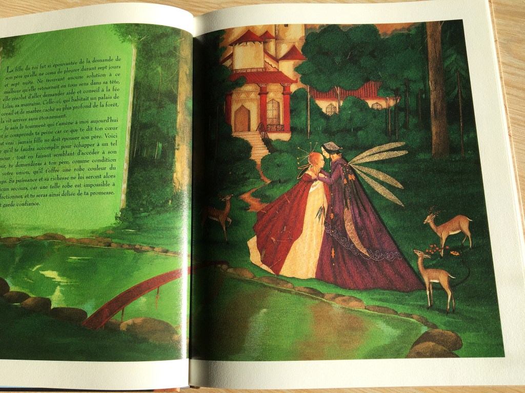 La folie du père s’éveilla. Devant l’impossibilité de tenir sa promesse, il réalisa que seule leur fille réunissait les qualités qui surpassait sa défunte mère. Il résolut donc de l’épouser…(là tout le monde admettra que ça se gâte pour la princesse…). Pour échapper à l’inceste promis par son père, la princesse demanda conseil à la fée Lilas sa marraine.