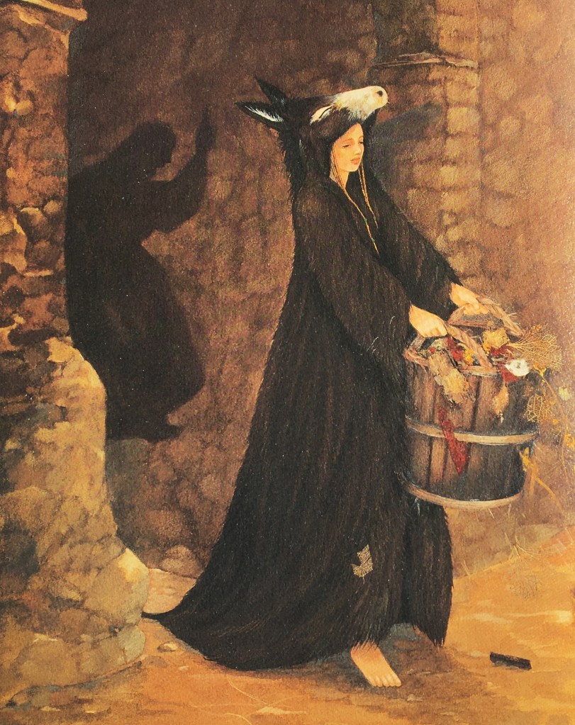 C’est dissimulée sous sa peau que la princesse prend la fuite, seule échappatoire aux projets de mariage de son père. Ainsi enlaidie, méconnaissable, elle marche sans s’arrêter. Réduite à la mendicité, elle trouve une place de souillon dans une ferme. Loin de son royaume, elle vit une existence misérable.